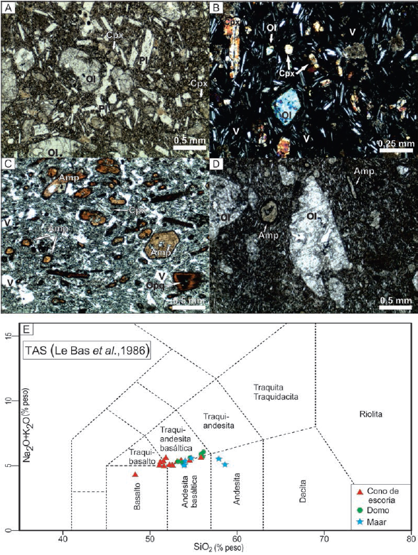 Los fragmentos juveniles presentes en las facies LCxps y Br tienen diferencias texturales y composicionales en los diferentes maares/anillos de tobas, diferenciándose tres grupos de rocas. El primer grupo (Ol-Cpx) son rocas con texturas porfídicas formadas por fenocristales de olivino (15%) y clinopiroxeno (10%) los cuales están inmersos en una matriz hialopilítica de microlitos de plagioclasa y clinopiroxeno, minerales opacos y vidrio. El segundo grupo (Pl-Cpx) son rocas con texturas porfíricas con fenocristales de plagioclasa (16%) y subordinadamente microcristales y fenocristales de clinopiroxeno (11%) englobados en una matriz intergranular formada por microlitos de plagioclasa, minerales opacos y vidrio. El tercer grupo (Ol-Amp, Fig. 10D) son rocas con texturas porfíricas formadas por fenocristales de olivino (16%) con bordes reabsorbidos y subordinadamente se encuentran microcristales y fenocristales de anfíbol (8%) y xenocristales de cuarzo con coronas de reacción de clinopiroxenos, todo en una matriz intersertal a pilotáxica formada por microlitos de plagioclasa y vidrio (Fig. 10D). Esta variabilidad mineralógica y textural también se ve reflejada en una composición geoquímica variable de los juveniles asociados a maares/anillos de tobas, la cual abarca desde andesítica basáltica/ traquiandesítica basáltica a andesítica (Fig. 10E). Dentro de la clasificación propuesta por Murray et al. (2015) para los magmas máficos de Puna Austral todas las muestras de maares/anillos de tobas se clasifican en el grupo “primitivo”.