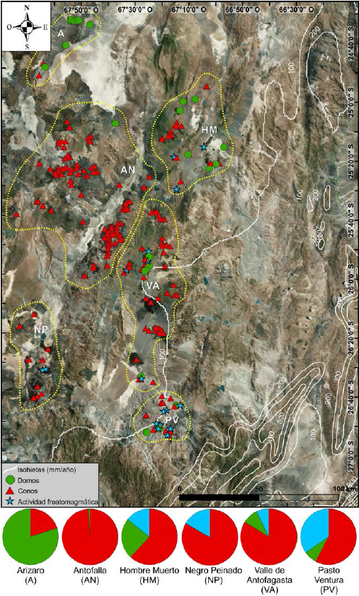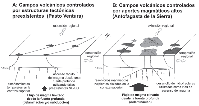 Por otro lado, la variabilidad de estilos eruptivos y tipología de estructuras volcánicas responde a la compleja interacción de diferentes factores endógenos y exógenos. La ocurrencia de estilos eruptivos estrombolianos con formación de conos de escoria se asocia a magmas que ascendieron rápidamente desde un reservorio profundo y que se desgasificaron de manera poco eficiente, conservando suficientes volátiles para fragmentarse cerca de la superficie y dinamizar erupciones explosivas. En contraste, la actividad efusiva que da lugar a la formación de domos y coladas dómicas se asocia a magmas que tuvieron etapas de estancamiento en la corteza media-superior donde sufrieron una significativa reducción de su temperatura y aumento de su viscosidad. Ambos factores dan lugar a una tasa de ascenso baja, permitiendo la desgasificación pasiva del magma dando como resultado erupciones efusivas. Finalmente, la abundancia de actividad freatomagmática en la región de Pasto Ventura se explica fundamentalmente por su posición geográfica en el borde este de la Puna donde las precipitaciones promedio son mucho mayores que en su interior. Esta actividad freatomagmática está representada por maares, anillos de tobas y facies predómicas (asociados con una fase freatomagmática inicial). La ocurrencia de estas diferentes estructuras está controlada por las características del substrato y la profundidad a la cual ocurre la interacción aguamagma.