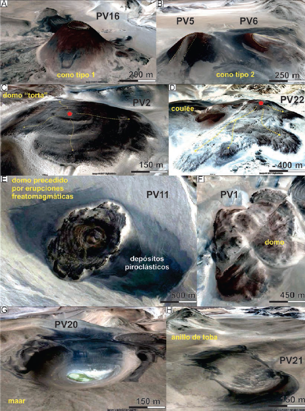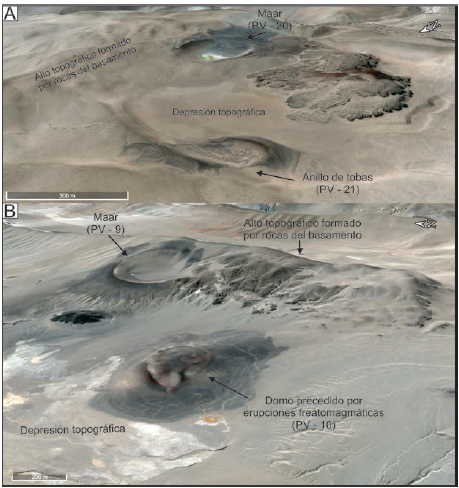 Se identificaron dos maares y tres anillos de tobas (Fig. 3). Los primeros tienen diámetros de borde de cráter (Dm) de 0,63 a 0,74 km, cuyos depósitos llegan a cubrir áreas de hasta 1,03 km2 (Apy) con un radio máximo de distribución (Rpy) de 0,69 km y razones de profundidad/diámetro (H/D) siempre mayores a 0,02 (Fig. 5G). En contraste, los anillos de tobas tienen diámetros menores (0,14-0,53 km), sus depósitos llegan a cubrir áreas de hasta 1,11 km2 y la razón profundidad/diámetro del cráter no supera 0,02 (Fig. 5H).