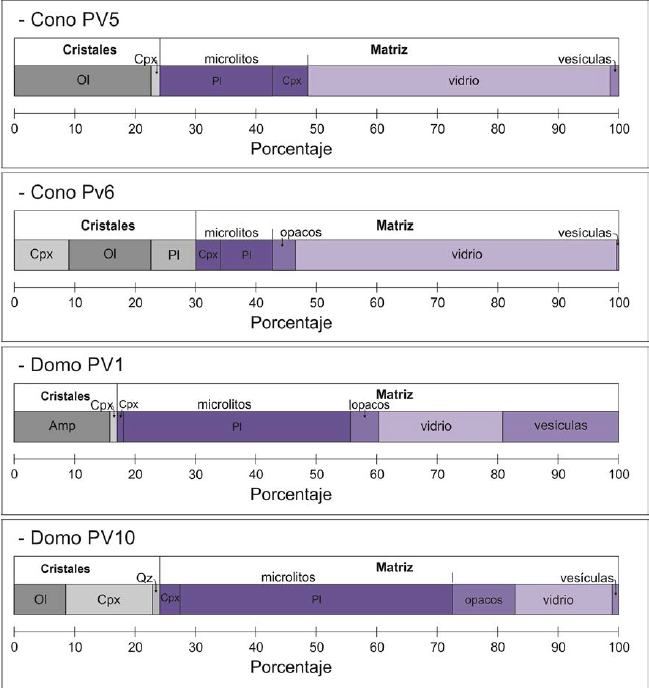 Las muestras pertenecientes a domos (facies Lvd), tienen texturas porfíricas con fenocristales de clinopiroxeno, proporciones variables de olivino y anfíbol inmersos en una matriz pilotáxica a intersertal, formada por microlitos de plagioclasas, clinopiroxenos, opacos y vidrio (Figs. 10B, C). El contenido de fenocristales varía entre 19 y 24% (Fig. 1 apéndice), y de acuerdo con la mineralogía predominante se diferenciaron dos grupos de rocas. El primer grupo (Cpx-Ol, Fig. 10B) está formado por rocas con fenocristales de clinopiroxeno (59,667,8%) y olivino (40,4-32,2%) que en muchos casos se encuentran con bordes de reabsorción o con halos de óxidos. El segundo grupo (Amp-Cpx, Fig. 10C) está formado por rocas con fenocristales de anfíbol (90,2-92,4%) y clinopiroxeno (9,8-7,6%). Los microlitos (>90% plagioclasa) en las muestras asociadas a ambos grupos tienen porcentajes que varían desde 41,3 a 59,5% y tamaños entre 0,1 y 0,3 mm (Fig. 1 apéndice). Es común en las muestras de domos la presencia de xenocristales de cuarzo que desarrollan engolfamientos, coronas de reacción de clinopiroxenos y en ocasiones están, parcial a totalmente reemplazados por agregados microcristalinos de clinopiroxeno. Los domos tienen variabilidad composicional más reducida, respecto a conos de escoria, ya que las rocas se clasifican como andesitas basálticas/traquiandesitas basálticas (Fig. 10E), siendo de manera general ligeramente más ácidos y con contenidos mayores de Na.O y K.O respecto a los conos de escoria. Las rocas se clasifican dentro del grupo “primitivo” propuesto por Murray et al. (2015).