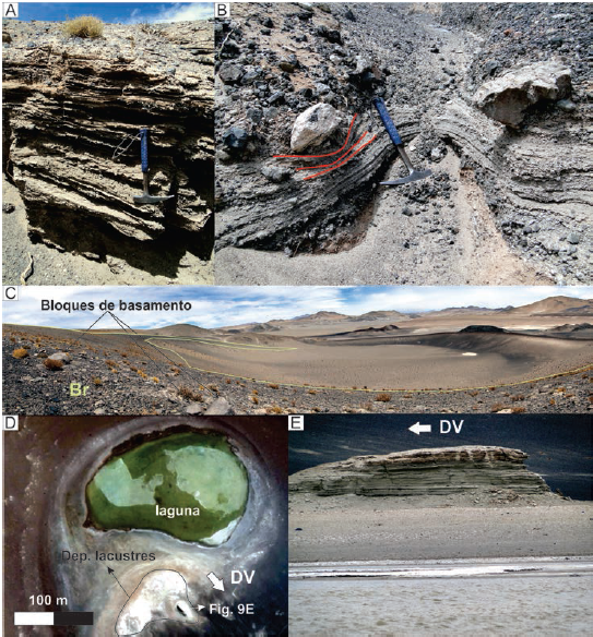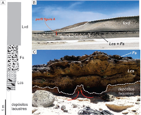 Como se mencionó anteriormente, se identificaron domos precedidos por erupciones freatomagmáticas (Def; Fig. 5E) y domos no precedidos por erupciones freatomagmáticas (Dnef; Fig. 5F). En el caso de los domos Def, estratigráficamente por debajo de las estructuras dómicas, constituidas por la facies de lavas (Lvd), se desarrollan secuencias de depósitos piroclásticos de hasta 2,5 m de espesor formadas por las facies de lapilli clastosoportada (Lcs) y lapilli-bombas soldada (Fs) (Figs. 9A, B). Estos depósitos piroclásticos se disponen, de manera general, en capas tabulares que se acuñan a medida que se alejan del centro del domo (de manera más marcada en las facies Fs), con un arreglo granocreciente, aunque en algunos casos se observan dos o más ciclos granocrecientes superpuestos (Figs. 9A, B). La zona basal está dominada por la facies Lcs interpretada como depósitos de caída asociados a erupciones freatomagmáticas. Hacia la parte superior de la secuencia es mucho más abundante la facies Fs, caracterizada por una baja explosividad y menor grado de fragmentación respecto a la facies Lcs. Estas variaciones verticales de facies sugieren que en el caso de los domos Def su emplazamiento ocurrió luego de una fase explosiva inicial relacionada con la interacción del magma con agua externa. En algunos sectores se observa que la secuencia piroclástica se apoya directamente sobre depósitos lacustres desarrollando estructuras de carga (Fig. 9C). Las mismas se generan por la rápida acumulación del material piroclástico sobre sedimentos no consolidados y saturados en agua. Esto sugiere que la interacción agua/magma ocurrió dentro de un cuerpo de agua superficial que, dadas las condiciones climáticas de la Puna, probablemente fue muy somero. La vaporización progresiva del cuerpo de agua durante la erupción permitió un pasaje desde una fase muy explosiva (facies Lcs), a una fase de baja explosividad (facies Fs) y finalmente a una fase efusiva con el emplazamiento del domo representado por la facies Lvd. Esta interpretación es consistente con la ausencia de fragmentos líticos accidentales en las facies Lcs y Fs. Los domos generaron estructuras relativamente simples donde no se observan estructuras superficiales de tipo rampas, espinas o lóbulos internos limitados por zonas de cizalla, sugiriendo que su mecanismo de emplazamiento fue tipo endógeno (sensu Hale y Wadge, 2008). Como se mencionó anteriormente, cuando la efusión ocurrió sobre una topografía plana se formaron domos con morfologías chatas que se expandieron en forma radial desde el conducto emisor (domos torta). En contraste cuando la efusión ocurrió sobre una topografía inclinada las lavas fluyeron siguiendo la pendiente formando coladas dómicas o coulées.