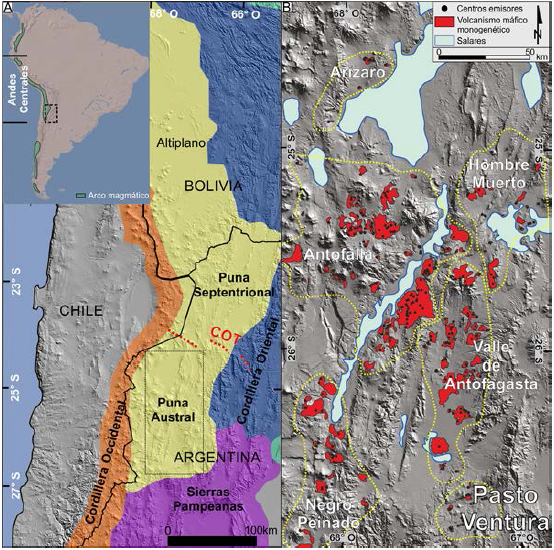 El magmatismo de la Puna Austral está representado por tres asociaciones volcánicas diferentes (e.g., Viramonte et al., 1984; Coira et al., 1993; Kay y Coira, 2009; Guzmán et al., 2014; Petrinovic et al., 2017): i. Estratovolcanes andesíticos-dacíticos del Mioceno temprano al Holoceno en el arco principal y del Mioceno medio al Plioceno a lo largo de los lineamientos transversales al rumbo andino en el trasarco (e.g., Grosse et al., 2017), ii. ignimbritas y domos de composiciones dacíticas-riolíticas del Mioceno temprano al Holoceno, en la mayoría de los casos asociados a calderas de colapso, tanto en el arco principal como en la región de trasarco (e.g.,Guzmán et al., 2017a), iii. Centros volcánicos monogenéticos máficos del Mioceno tardío al Holoceno en el trasarco (e.g., Maro et al., 2017a).