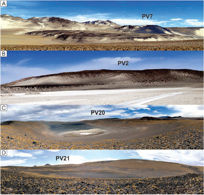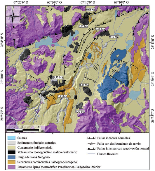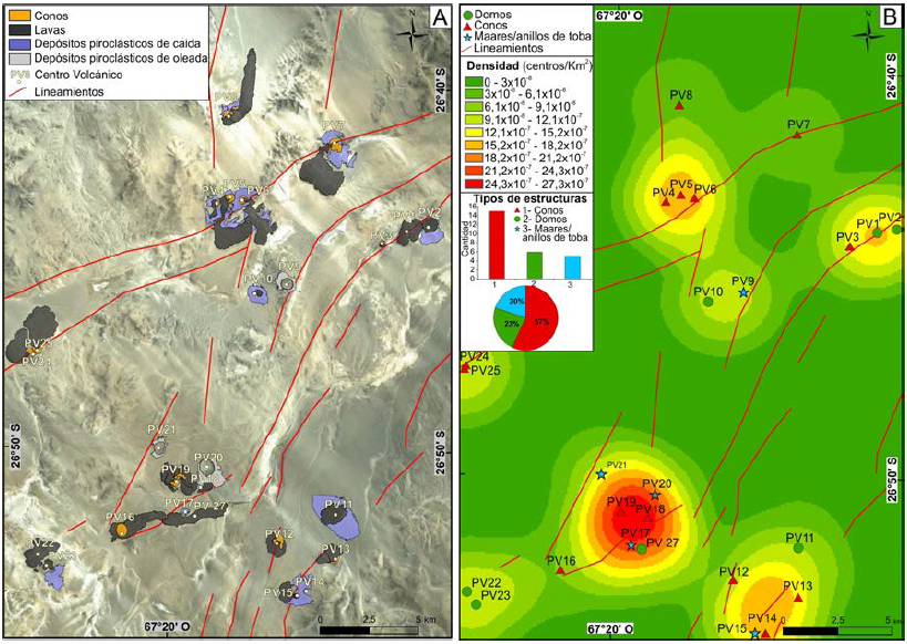 El volcanismo monogenético de la región de Pasto Ventura está caracterizado por la emisión de pequeños volúmenes de magma máfico (0,42 km3, volumen total de material emitido) e individualmente los centros eruptivos son pequeños (no superan los 0,2 km3, Apéndice tablas 1 y 2) comparados con los de otras agrupaciones volcánicas de la Puna Austral (e.g.,Antofagasta de la Sierra, Báez et al., 2017). Otro rasgo característico es la variedad de estructuras volcánicas presentes: conos de escoria (57%), domos (23%) y estructuras freatomagmáticas (20%) de tipo anillos de tobas (tuff rings) y maares (Figs. 3 y 4). Por otro lado, el volcanismo de Pasto Ventura también se caracteriza por una baja densidad de centros eruptivos (2,43x10-6 centro/km2; c/km2) comparado con otros campos volcánicos monogenéticos [1,15x10-1 c/km2 Pali Aike (Patagonia), 7,95x10-2 c/km2 Abu (Japón); Le Corvec et al., 2013]. En las figuras 2 y 3 se puede apreciar la distribución espacial de los distintos centros volcánicos, los cuales tienen una tendencia a agruparse a lo largo de las fallas inversas, orientadas principalmente NNE-SSO y NE-SO, reactivadas con cinemática normal y de rumbo, mientras que las fallas normales menores orientadas en dirección NO-SE no presentan estructuras volcánicas asociadas. El carácter sintectónico del volcanismo monogenético de la región de Pasto Ventura queda reflejado no solo por la distribución espacial, sino también por la asociación temporal de las estructuras volcánicas y las trazas de las fallas (Zhou et al., 2013).