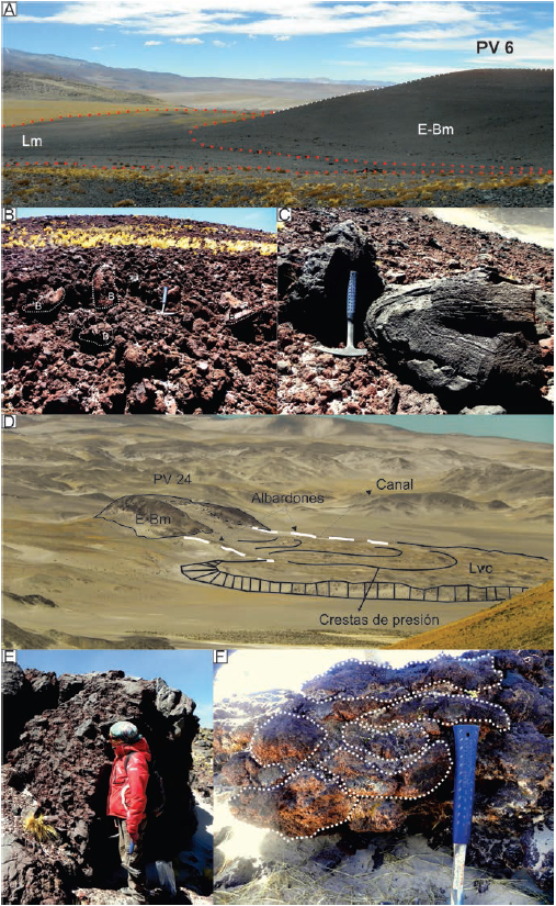 Facies de lavas (Lvc). La mayoría de los conos tienen coladas de lavas asociadas con espesores entre 2 y 5 m, y morfologías en planta elongadas, expandidas o deltaicas. Las mismas están formadas por rocas de color negro con texturas porfíricas, con fenocristales de olivino, piroxeno y plagioclasa en una matriz afanítica. También son abundantes los xenocristales de cuarzo y xenolitos de rocas del basamento ígneo-metamórfico. Dentro de las mismas es posible reconocer zonas de albardones con lavas poco vesiculares y coherentes, así como zonas de canal con lavas muy vesiculares y autobrechadas (Fig. 6D). En las zonas de canal se reconocen crestas de presión que indican las direcciones de flujo (Fig. 6D).