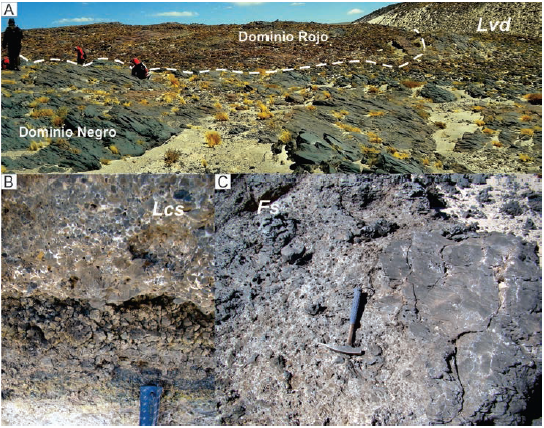 Facies de lavas (Lvd). Se trata de lavas máficas coherentes que constituyen el cuerpo principal de las estructuras dómicas. En la superficie de los domos se reconocen crestas de presión concéntricas. Son rocas con texturas porfíricas formadas por fenocristales de olivino y piroxeno o anfíbol y piroxeno (dependiendo de la estructura dómica) en una matriz afanítica. En general son abundantes los xenocristales de cuarzo y xenolitos de rocas ígneas y metamórficas del basamento. Estas lavas se pueden separar sobre la base de su color en un dominio rojo y un dominio negro (Fig. 7A). La diferencia entre ambos dominios es un mayor grado de vesiculación y grado de alteración (oxidación) en el dominio rojo respecto al dominio negro. En algunos casos cada dominio ocupa un importante volumen del domo y están separados por contactos netos. En otros casos a escala centimétrica, se observa el desarrollo de sucesivas bandas de rocas de uno y otro dominio. Ambos dominios presentan la misma composición y proporción de fenocristales (los cuales varían en cada domo).