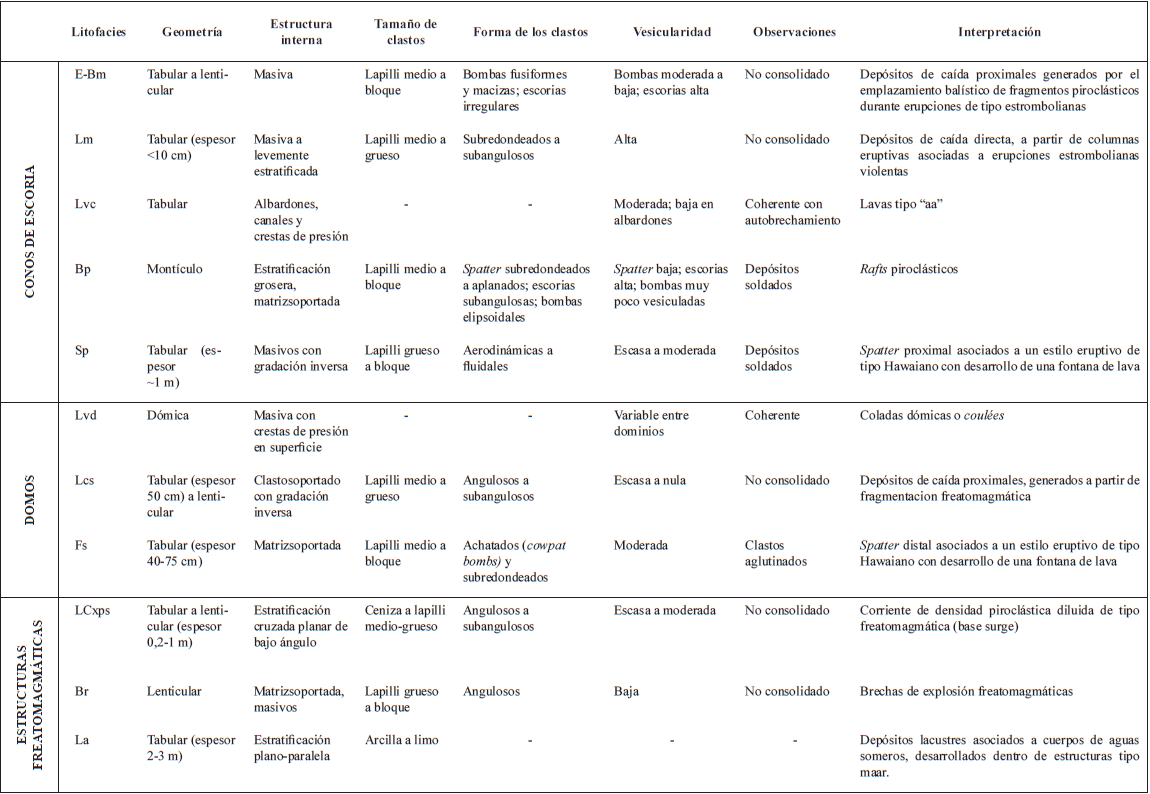 La escasez de buenos afloramientos no permitió realizar correlaciones estratigráficas que permitan reconstruir la arquitectura litofacial interna de estas estructuras. Sin embargo, a partir de las observaciones de campo realizadas se pueden hacer inferencias respecto a los procesos operantes durante la formación de las estructuras volcánicas freatomagmáticas. Las facies de brechas masivas (Br) caracterizan las zonas proximales en el borde de los cráteres de las estructuras freatomagmáticas. Sin embargo, esta facies está mucho mejor representada en las estructuras de tipo maar. Tanto en los maares como en los anillos de tobas en las zonas más distales son abundantes los depósitos piroclásticos con estructuras tractivas (facies LCxps). Ambas facies son ricas en fragmentos líticos en el caso de los maares y pobres en fragmentos líticos accidentales en el caso de los anillos de tobas. Estas características son consistentes con los mecanismos de formación de ambos tipos de estructuras. Los maares son estructuras que se desarrollan fundamentalmente por interacción agua/magma debajo del nivel topográfico preeruptivo, lo que explica la abundancia de fragmentos líticos accidentales en sus depósitos. En contraste, los anillos de tobas son estructuras constructivas desarrolladas sobre el nivel topográfico preeruptivo, por lo que sus depósitos tienen un bajo porcentaje de fragmentos líticos accidentales. Estas diferencias entre maares y anillos de tobas también explican la ocurrencia de cuerpos de agua dentro de los primeros.