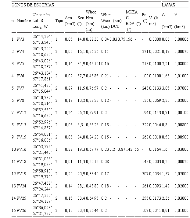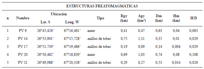 (*) Distancia máxima alcanzada por los depósitos desde el centro emisor (Rpy), área de los depósitos piroclásticos (Apy), diámetro de la estructura (Dm), altura (Hm), relación profundidad/diámetro (H/D).