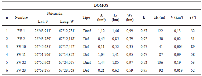 (*) Def: domos precedidos por erupciones freatomagmáticas; Dnef: domos no precedidos por erupciones freatomagmáticas. Área (A), elongación máxima (Ls), ancho (Ws), elipticidad (E=Ws/Ls), altura (Hs), volumen (V), azimut del eje de máxima elongación (e).