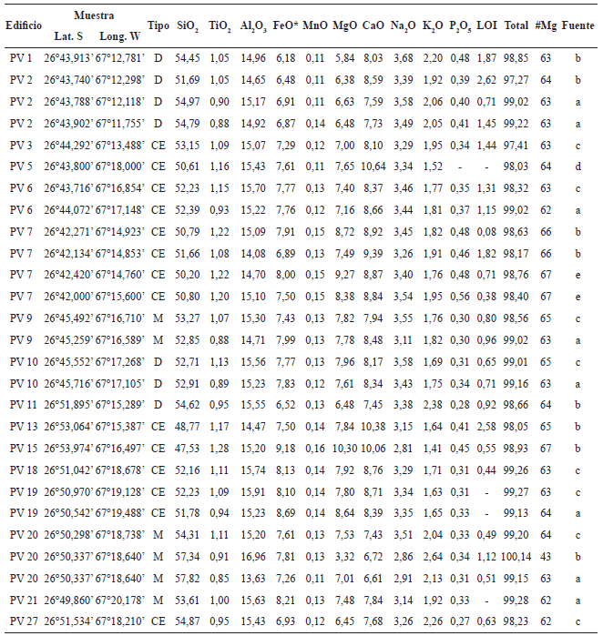 *) Óxidos expresados en % en peso y ajustados a 100% en base anhidra. FeO*: Fe total; LOI: pérdida por calcinación. a. Este trabajo; b. Drew et al., 2009; c. Murray et al., 2015; d. Kay et al., 1994; e. Risse et al., 2013. CE: conos de escoria; D: domos; M: estructuras freatomagmáticas.