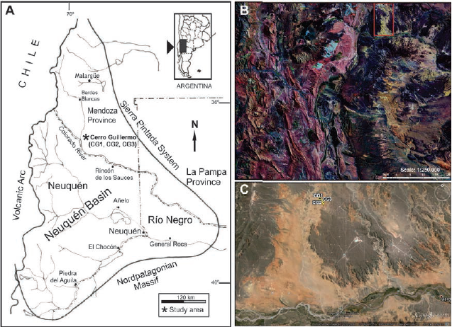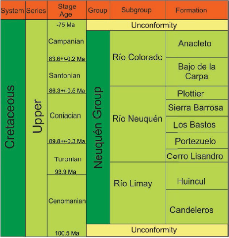 In southern Mendoza, in the Cerro Guillermo (CG) study area, the most ancient outcropping strata of the Neuquén Group correspond to the Cerro Lisandro Formation (middle-late Turonian), Río Neuquén Subgroup. The Río Neuquén Subgroup (middle Turonian-early Santonian) comprises an interbedded succession of muddy and sandy deposits. It is covered by sandstones, shales and conglomerates of the Río Colorado (Santonian-early Campanian) Subgroup (Garrido, 2010). The Río Neuquén and Río Colorado subgroups include sedimentary sequences composed of alluvial plains and channel complexes that periodically alternate, forming two distinct facies associations (González Riga and Astini, 2007). According to Previtera (2011), the basal levels of the outcrops here described and that are located northwards and eastwards of the CG were assigned to the Plottier Formation (late Coniacian-early Santonian) (Hugo and Leanza, 2001; Garrido, 2010), Río Neuquén Subgroup. Whereas that the cuspidal levels outcropping in the CG were correlated with the Bajo de la Carpa (Santonian) (Hugo and Leanza, 2001; Garrido, 2010) and Anacleto (early Campanian) (Legarreta and Gulisano, 1989) formations, Río Colorado Subgroup.