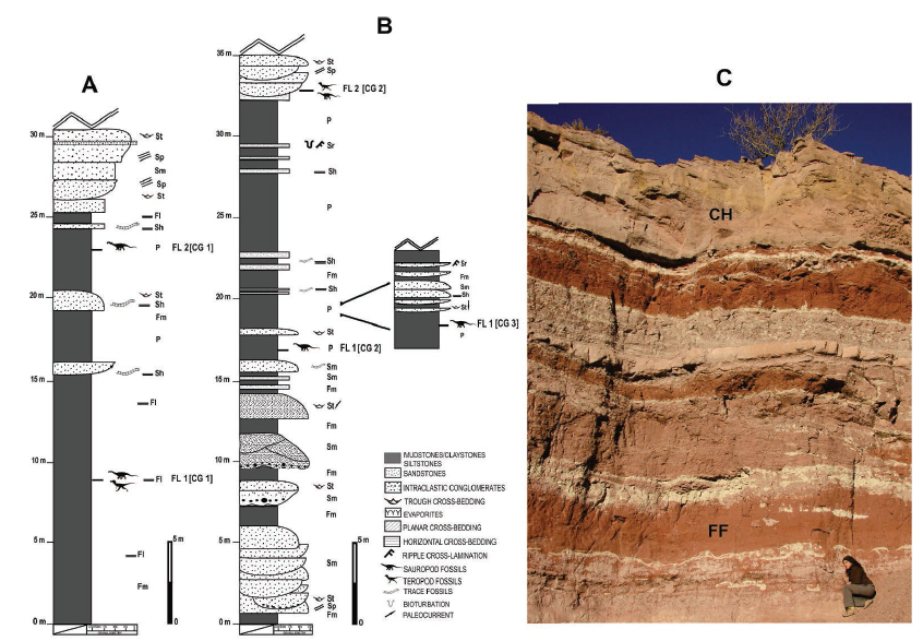 Red beds outcropping in the Plottier Formation at the CG area include three different fossiliferous sites (CG1, CG2 and CG3, previously shown in figure 1) here analyzed. The architectural arrangement of these units shows the development of the fluvial system (Fig. 3). Sedimentary features of these deposits refer to tractive high energy fluvial facies (channels and bars) interbedded with fine floodplain facies. Based on the codes and definitions summarized by Miall (1996), distinct alternating facies associations are recognized within the succession in CG. These associations represent floodplain environments and sandy fluvial channel complexes (Fig. 3), whose lithofacies and architectural elements are summarized in table 1. Facies associations are described below as (A) floodplain and (B) fluvial channel.