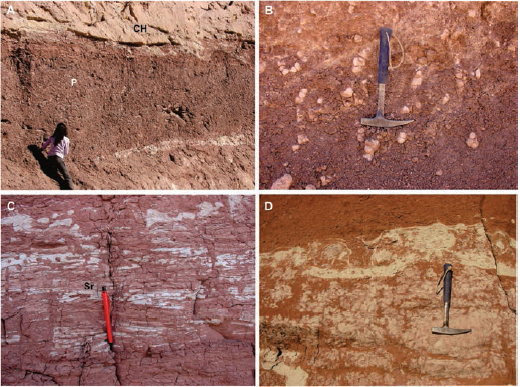 This association includes red massive and mottled mudstones, claystones and siltstones (Fm), rarely laminated (Fl) interbedded with tabular or lenticular sandstones (Sm, Sh, Sr, St, Sp) and paleosol levels (P). Within the massive intervals (Fig. 4A), intense disruptions of original sedimentary structures and fabrics occur by tubular burrowing (possible pedotubules), infiltrated clay partings, and local abundance of irregular, massive clay-rich glaebules and calcareous nodules composed mainly of calcite and quartz (Fig. 4B). Less frequent intervals of 0.5 m show fine sandstones that locally contain pelitic intraclasts and ripple cross-lamination (Fig. 4C). Horizons with intense greenish grayish mottling and diffuse boundaries are also present. The paleosol levels (P) comprise red, whitish and visibly mottled sandy mudstones with proportions of fine to medium- grained 5-10% (Fig. 4D).