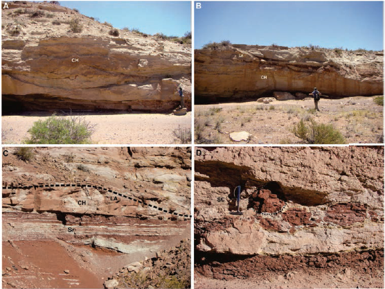 A variety of distinct, large-scale bodies (1-5 m) of coarse sandstones ranging in size from lens to sheet-like geometries, predominantly fine-grained succession at a broader scale. Such packages conform a higher hierarchy elements that are limited by significant stratigraphically surfaces (third order, sensu Miall, 1996). These sandstone bodies frequently show internal amalgamation and yield lateral continuity of several kilometers (Fig. 5A). The individual channels have an irregular base and a series of structures reflecting a gradual decrease in the flow regime. Progressively thinner trough and planar cross-bedded sets (mesoscale St and Sp) are recorded near the top of individual sandstone bodies, which end up at the top with fining-upward arrangements. Within this association, it is frequently observed lateral accretion surfaces (Fig. 5B). Between each deposit of individual sandy channels, there are fine facies deposits reflecting episodes of decantation (Fig. 5C). This facies is composed of coarse-grained sandstones with abundant pelitic intraclasts that can reach 1m in diameter (Fig. 5D) arranged in banks of up to 2 m thick and lenticular geometry. Also, this association contains isolated bones of indeterminate sauropod and theropod dinosaurs transported as basal lag deposits.
