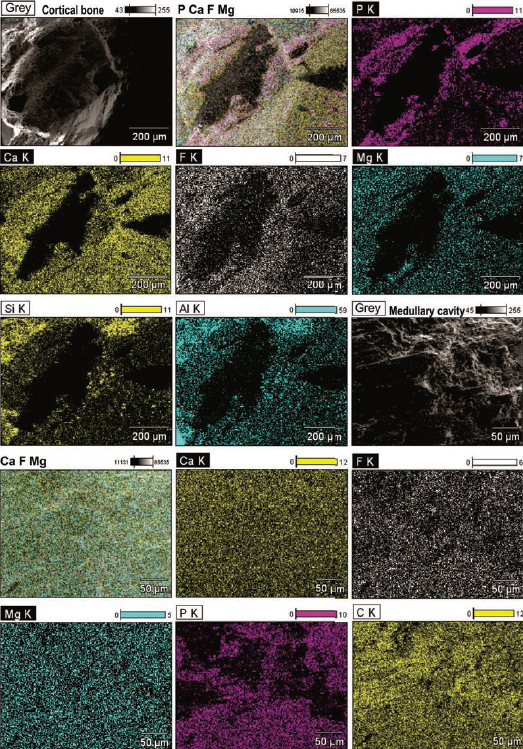 Images and maps were performed in the thin- section of the femoral fragment IANIGLA-PV.113 to monitor trends in elemental distributions (Fig. 6).