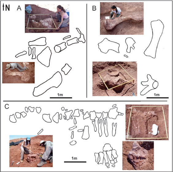 Associated specimens are frequently found and they represent the most common preservation mode in the studied sites. Disarticulated but still associated bones of a sauropod indet. were preserved in the sandy mudstones deposited on the floodplain in the (CG1 site, fossil level (FL 2)). These lithofacies show scarce development of paleosol horizons and the sedimentation rate was slow and essentially episodic.