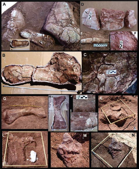 Incomplete skeletons usually include associated remains of the axial and appendicular skeleton, ranging from 2 to 3 disarticulated bones to accumulations of partly articulated remains from various body parts (e.g., Smith et al., 2002; Van Itterbeeck et al., 2004; González Riga et al., 2007; Csiki et al., 2010; Smith et al., 2015). This taphonomic mode is registered in the fossil level (FL1) in both CG2 and CG3 sites and comprises two associated partial skeletons assigned to Notocolossusgonzalezparejasi. The dinosaur remains also were preserved in the sandy mudstones deposited on the floodplain facies, but in this case, the lithofacies show a well-developed paleosols. In the dinosaur- bearing lithofacies, the processes of bioturbation and pedogenesis were very intense and contributed to the oxidation of sediments and recycling of organic matter. The carbonates and other minerals available in this depositional environment caused the rapid permineralization and partially articulated preservation of the specimens.