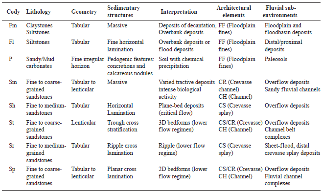 The floodplain facies association is comparable to Miall’s (1985, 1996) FF architectural element and is interpreted as a product of accumulation (vertical- accretion deposits) of fines in variously drained, low-gradient floodplains. These deposits were formed from subaqueous sedimentation dominant processes associated with shallow lacustrine bodies. However, part of this association could also have eolian origin “paleoloess”. Overall, thin-bedded tabular sandstones are interpreted as crevasse splay deposits caused by episodes of deposition when waning floods overtop the river banks (Miall, 1996; Bridge, 2003; Fisher et al., 2007). These sandy facies reflect the origin of overflows caused by episodic flooding and flood irregular sheets (Miall, 1996) fed from the crevasse channel (CR).