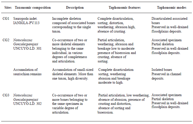 The dinosaurs of Cerro Guillermo (CG1, CG2 and CG3 sites) from the Plottier Formation occur in three distinctive taphonomic modes within mudrock and sandstones of the facies associations (A-B) accumulated on a f loodplain, and also complexes of channels, respectively . Most of the dinosaur remains found correspond to sauropods recovered in facies of floodplains. In contrast, the isolated bones of sauropod and theropod transported together through fluvial channels are scarce. Every taphonomic mode reflects the interactions between taphonomic attributes of fossils and the sedimentary context prevailing between death and final burial. Each dinosaur taxon was assigned a taphonomic mode modified from those proposed by Eberth and Currie (2005) according to the following criteria: (1) Disarticulated/Articulated (complete or partial), (2) Associated, or (3) Isolated. The taphonomic modes derived from Cerro Guillermo (CG1, CG2 and CG3) assemblages are described below.