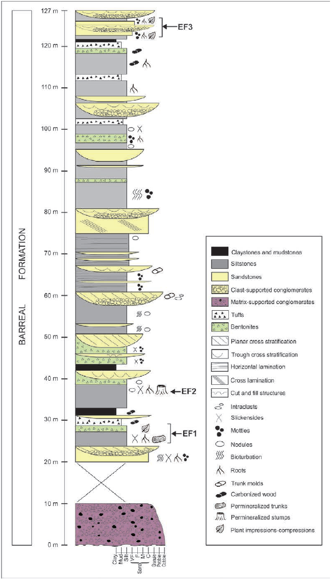 Afterwards, Bodnar (2010) defined eight fossiliferous strata (EF) in the Cortaderita Formation. The fossiliferous strata EF2, EF3, and EF4, represent horizons with in situ fossil forests. They are composed of permineralized trunks and stumps, and impression-compressions of leaves and branches. More recently, Bodnar et al. (2015) described two fossiliferous strata (EF) in the Barreal Formation and nine in the Cortaderita Formation, whose fossil content was partially studied (particularly the conifer fossil remains). Table 1 summarizes the location and correlation of the fossiliferous strata, as described by the different authors.