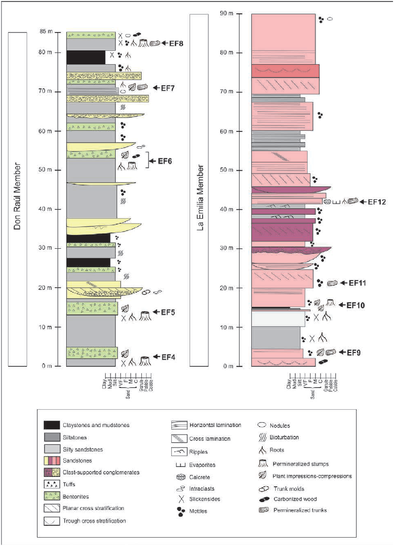 EF8 consists of a permineralized forest studied by Bodnar (2010), exclusively constituted by stumps in life position and trunks of corystosperms (R. cortaderitaense) preserved in greyish massive bentonitic and edafized siltstones, muddy-sandstones (lithofacies Fm and Fr), and greenish bentonites (lithofacies T).