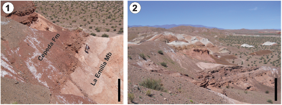 Formation. We observed a transitional passage between the Don Raúl and La Emilia members, which is defined here as the contact located at the beginning of the first laminated, fine-grained, pink-red to purplish sandstones. Detailed sedimentological studies at the La Cortaderita and La Tinta creeks does not show any evidence of large depositional or temporal gap in the boundary between the two members, although contrasting colours and palaeoenvironmental changes can be recognized between them.