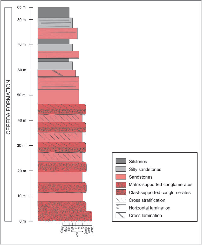The lower section of the Cepeda Formation is interpreted as deposited by alluvial systems, with eventual lobes of gravity-flow deposits. The upper section of the Cepeda Formation is inferred as developed by an ephemeral fluvial system, mostly based on the association of tabular sandy bodies with plane-bed flow (critical flow regime; lithofacies Sh, Sl and Sm, Table 2) and fine-grained deposits (lithofacies Fm, Table 2).