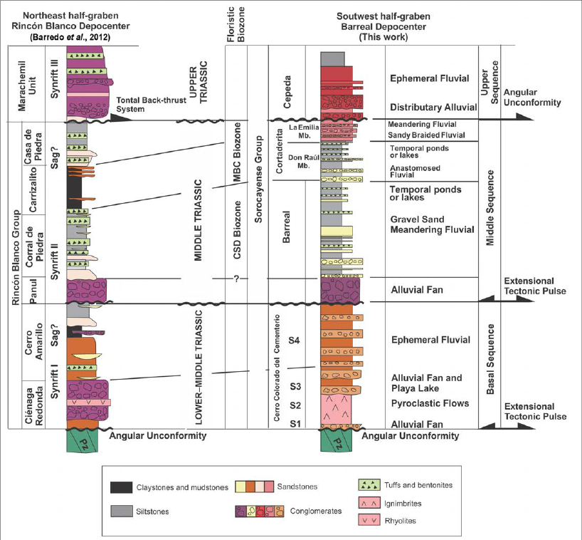 Conversely, the correlation resulting in this work is in agreement with Barredo (2012) and Barredo et al. (2012), who defined the first rifting pulse within the half graben evolution (synrift I), which is characterized by alluvial-fluvial and shallow lacustrine deposits, and encompassed the Ciénaga Redonda Formation and the lower half of the Barreal Formation (equivalent to Cerro Colorado del Cementerio Formation).