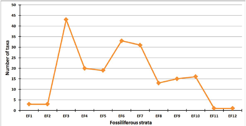 The floristic diversity was evaluated using the species richness (number of species) per fossiliferous stratum. The curves of species richness were obtained with the help of the PAST software (version 3.18 beta), using the “range-through assumption” (Hammer et al., 2001).