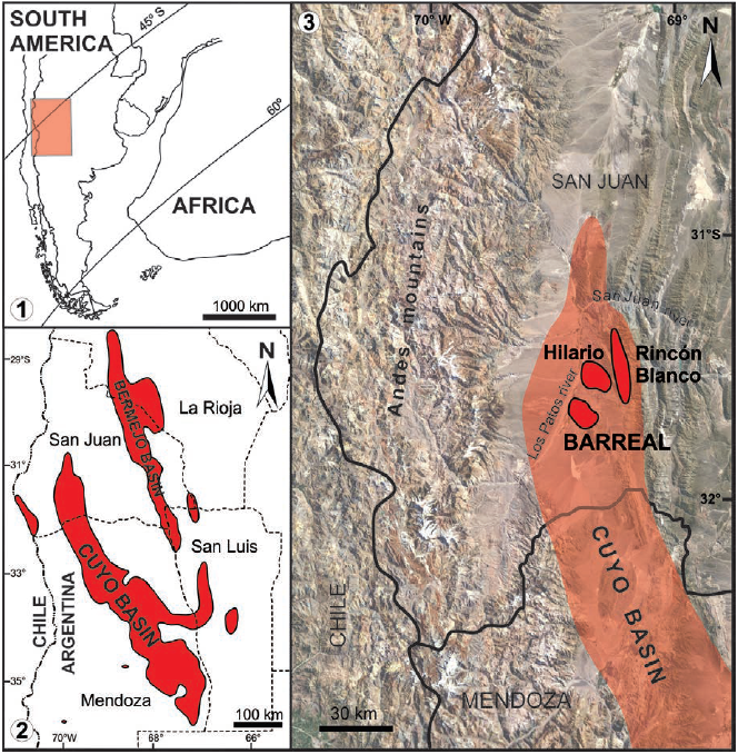 The most complete Triassic basins of Southwestern Pangea are located near the Proto-Pacific margin of the South American plate. They are narrow and elongated depressions that are oriented NW-SE (Charrier, 1979), filled by continental sedimentation in Argentina and marine to transitional in Chile. The largest continental Triassic depocenter is the Cuyo (or Cuyana) Basin, which is floored on the Choiyoi Group, an intraplate Permian-Triassic plutonic- volcanic complex. It covers an area of 60,000 km2 and includes several depocenters filled with siliciclastic continental deposits (e.g.,Borrello and Cuerda, 1965; Stipanicic, 2001; Barredo and Stipanicic, 2002). The Cuyo Basin corresponds to a continental rift basin developed as a result of generalized extension, induced by crustal thinning and collapse of the Upper Palaeozoic (Gondwana) orogen (Llambías and Sato, 1990, 1995; Spalletti, 1999) and the early Mesozoic Pangea breakup (e.g., Uliana et al., 1989; Barredo and Ramos, 1997; Zerfass et al., 2004). The basin shows strong asymmetric structural and depositional features, as well as intrabasinal highs and/or transfer zones that bind the different depocenters (Legarreta et al., 1992; Kokogian et al., 1988, 1993; Ramos and Kay, 1991; López Gamundi, 1994; Spalletti, 1999, 2001a; Rincón et al., 2011).