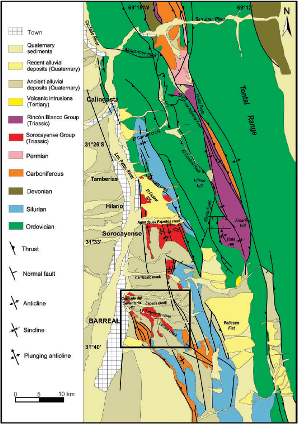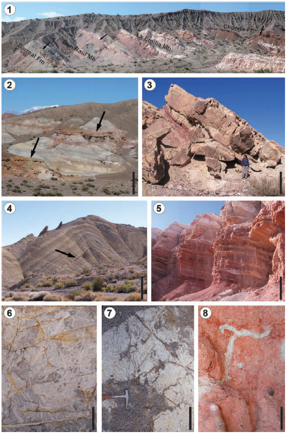 The region between Barreal and Hilario towns is characterized by a series of east-west oriented creeks, where the Sorocayense Group is exposed. From north to south, they are: El Alcázar, Agua de los Pajaritos, El Carrizal, Algarrobito, Cepeda, La Cortaderita, La Tinta, Los Sanjuaninos and Un Salto creeks (Fig. 2). The Sorocayense Group is highly affected by tectonic deformation, resulting in broad folding with synclines and anticlines, and faults; consequently, the stratigraphic column is repeated at several places with north-south orientation along the area between Barreal and Hilario. The Sorocayense Group comprises three, four or five formations, depending on the authors (Groeber and Stipanicic, 1953; Baraldo and Guerstein, 1984; Barredo, 2012), at Hilario depocenter, and three formations in Barreal. At this last depocenter, the group was divided from the base to the top into the Barreal, Cortaderita, and Cepeda formations (Groeber and Stipanicic, 1953; Stipanicic, 1972).