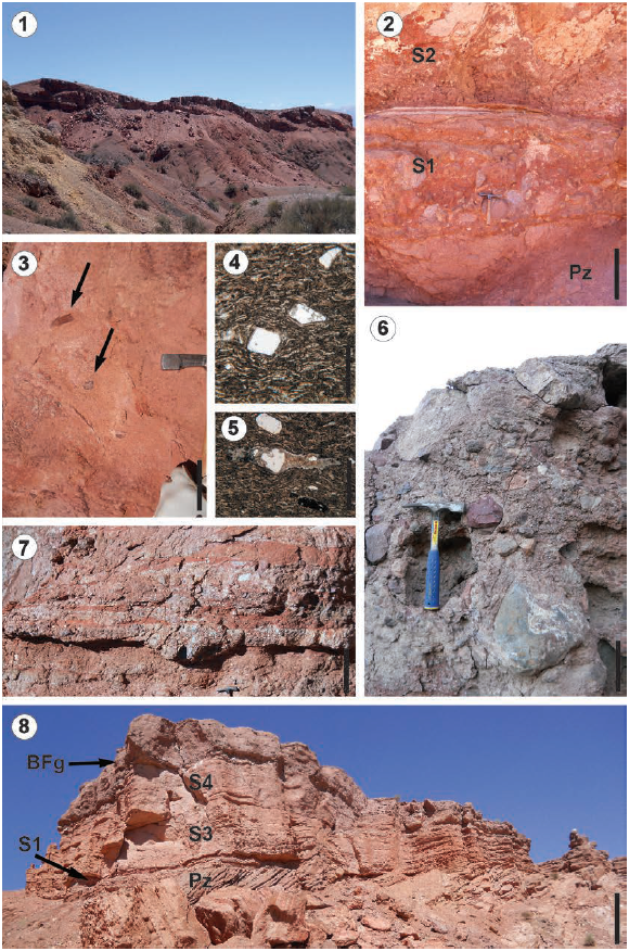 The type section for this member is defined at Colorado del Cementerio hill between 31º36’59’’S/69º27’7,6’’W and 31º36’45,7’’S/69º26’58,9’’W, although it can be also recognized in the Cementerio and Un Salto creeks. It overlies by an angular unconformity over the Pituil Formation (Upper Carboniferous), and is covered by the Barreal Formation by an erosive unconformity. The Cerro Colorado del Cementerio Formation has a thickness of 75 m. This unit can be divided into four sections, which are well represented at Colorado del Cementerio hill, while only the two lower sections outcrop in the Un Salto creek. The section 1 (Figs. 4.1, 4.8) displays a variable thickness, reaching a maximum of 2 m and filling a Palaeozoic palaeorelief over an angular unconformity (Fig. 4.2). It consists of lenticular bodies of matrix-supported polymictic conglomerates (lithofacies Gmm, Table 2). Most of the lithoclasts are subrounded volcanic and angular Palaeozoic blocks up to 20 cm in diameter (Figs. 4.2, 5).