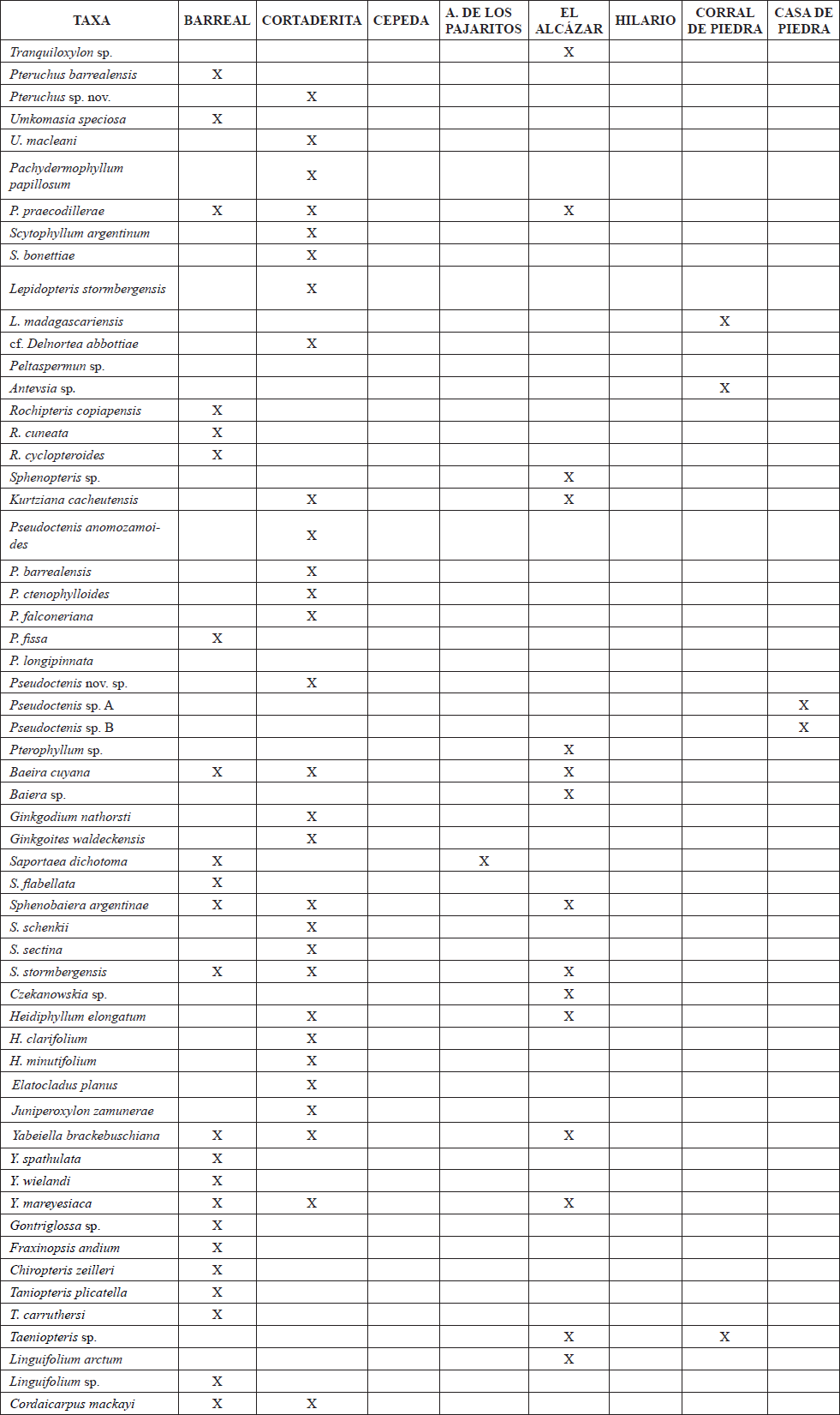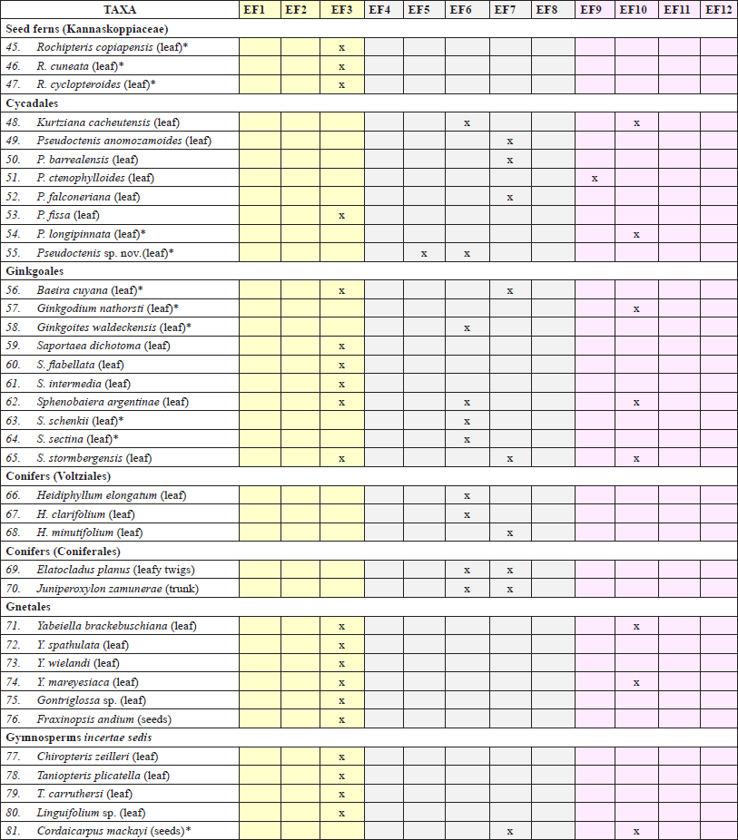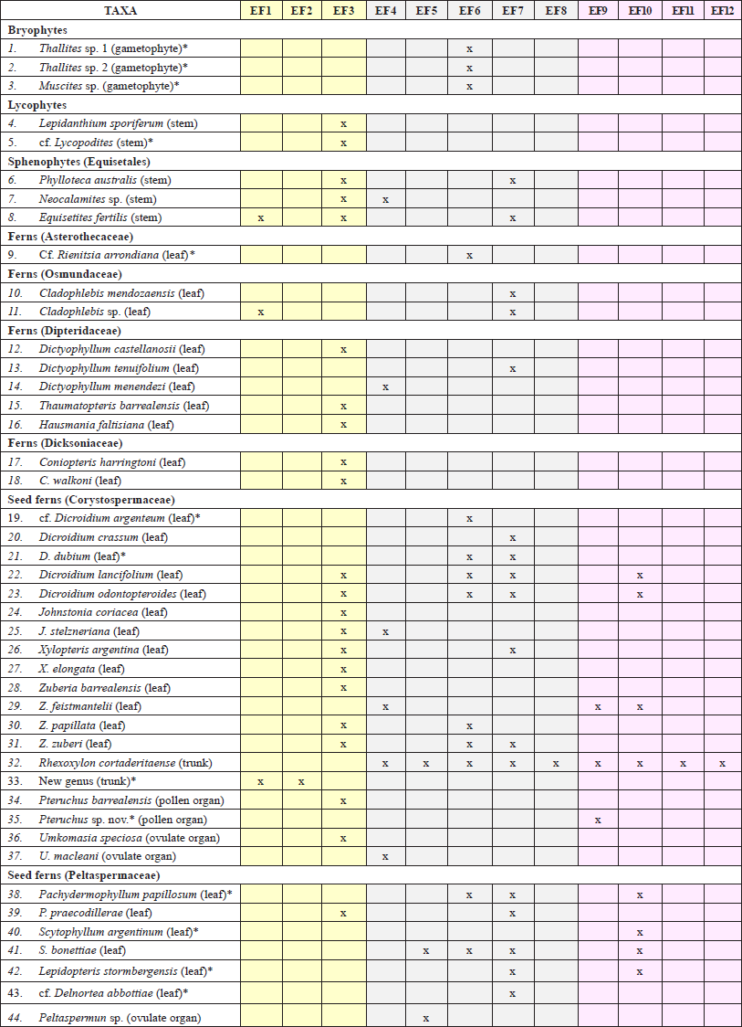 The EF1, EF2 and EF3 strata were found at the Barreal Formation. EF1 and EF2 constitute totally new fossil levels, as they consist of permineralized stumps in life position of corystosperms, which are preserved in grey massive siltstones, altered by bioturbation and soil development (lithofacies Fr, Table 2), and covered by bentonites (lithofacies T, Table 2). Furthermore, impressions of equisetalean axes and osmundacean leaves were identified at EF1; and trunk moulds and leaf compressions of undetermined gymnosperms at EF2. On the other hand, the EF3 fossiliferous stratum coincided partially with the NFI level studied by Bonetti (1963), since the fossiliferous horizon found by this author at the La Cortaderita creek (and described as “NFI punto 12”) is actually located in the Cortaderita Formation, as indicated by Zamuner et al. (2001). Furthermore, we found that the NFII level described by Bonetti for the Cortaderita Formation at the Un Salto creek (and named as“NFII punto 20” and “NFII punto 21”) is placed in the upper section of the Barreal Formation, and thus both correspond to the EF3 (Table 1). The EF3 stratum preserves abundant plant fossils as impressions-compressions, comprising leaves and reproductive structures of dipteridacean ferns (genera Dictyophyllum, Thaumatopteris and Hausmannia), ginkgoales (e.g., Saportaea spp.), corystospermales (e.g., Zuberia spp., Pteruchus barrealensis, Umkomasia speciosa), gnetales (e.g., Yabeiella spp.), and cycadales (Pseudoctenis fissa), and stems of lycophytes and equisetales in grey claystones, siltstones and sandstones (lithofacies Smp, Fm, Fsm and Fr) interlayered with few lenticular and tabular bodies of massive sandstones and cross-stratified fine conglomerates (lithofacies Sm, Gm and Gt). From the fossiliferous strata described by Artabe et al. (1995), only the third one could be identified and located during field trips and is correlated with EF3. For this reason, those levels and the taxa registered in them were not included in the present palaeofloristic analysis.