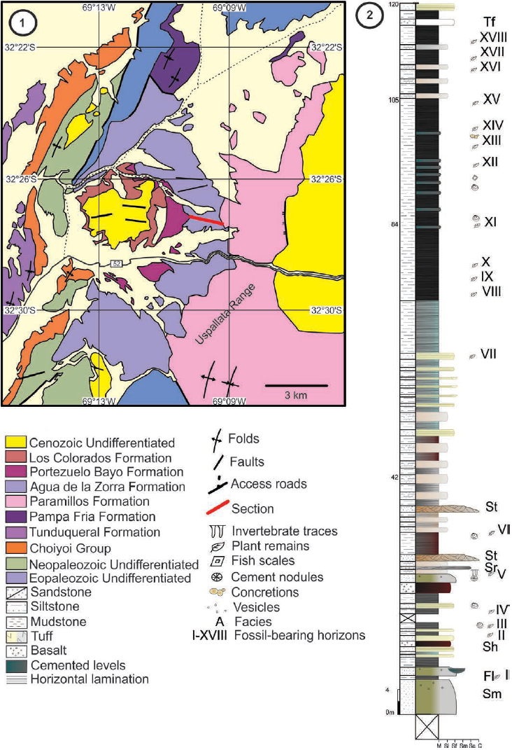 Plant remains were systematically collected in the Agua de la Zorra Formation at the Paramillos de Uspallata locality in several fieldtrips between 2015 and 2017. Eighteen fossil-bearing horizons were reported and several specimens were collected from them. The fossil-bearing horizons are identified with roman numbers from I to XVIII (Fig. 1. 2).