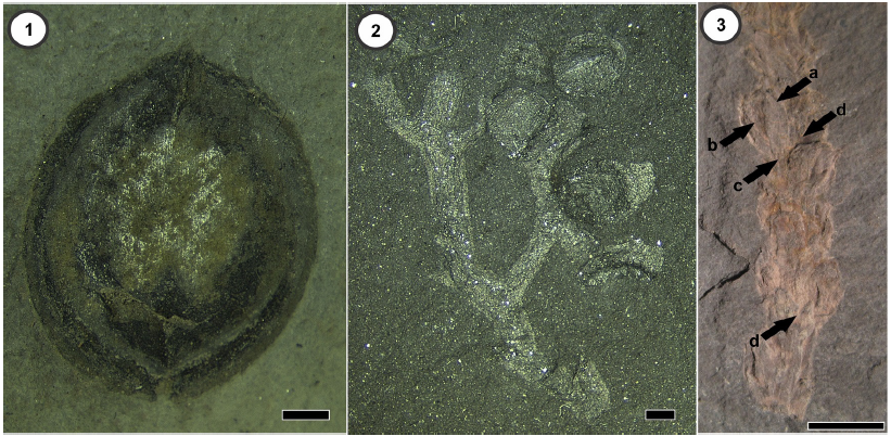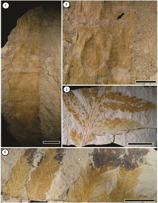The recovered material includes leaf fragments, stems associated with leaves and reproductive structures. They are preserved as carbonaceous compressions and/or impressions in black shales and yellow mudstones from different levels of the unit. They occurred as fragmented plant elements, with variable size, densely packed or isolated, and with weak orientation preferences.