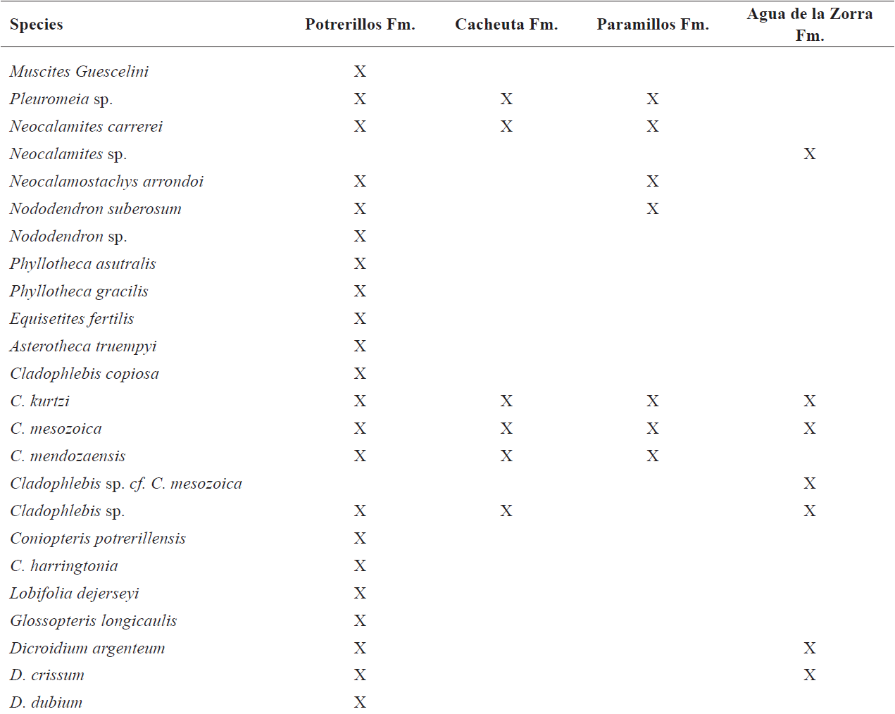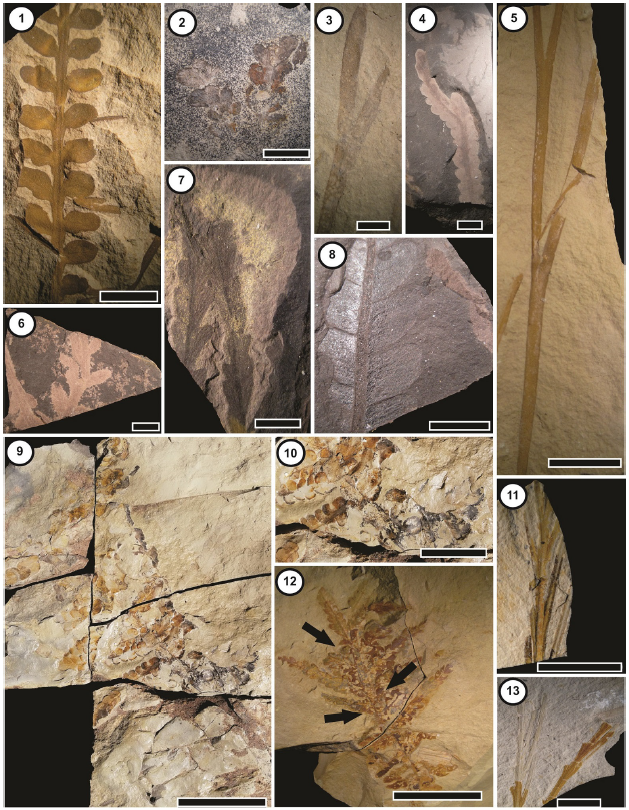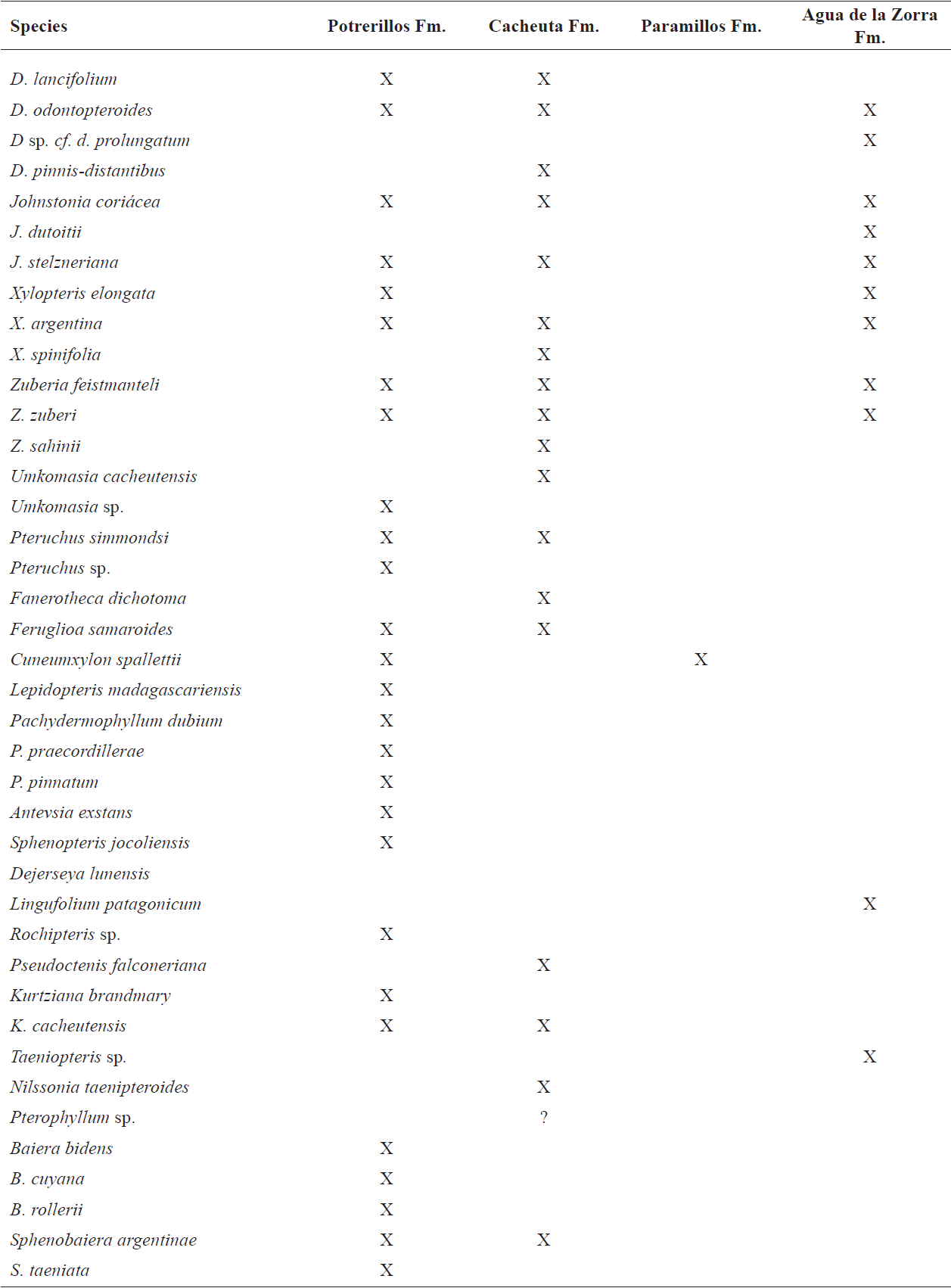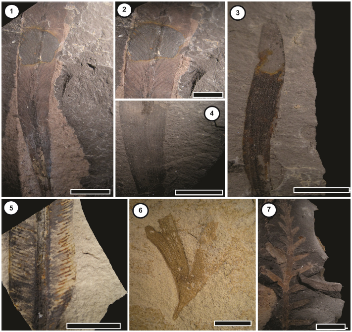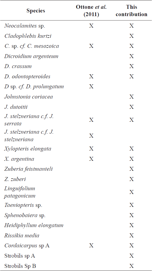 The fossil material is housed at the Paleobotanical Collection of the Instituto Argentino de Nivología, Glaciología y Ciencias Ambientales (IANIGLA) in Mendoza city, Argentina, under the prefix IANIGLA-PB, and at the Paleobotanical Collection of the Departamento de Ciencias Geológicas, Facultad de Ciencias Exactas y Naturales, Universidad de Buenos Aires under the prefix BAFC-Pb.