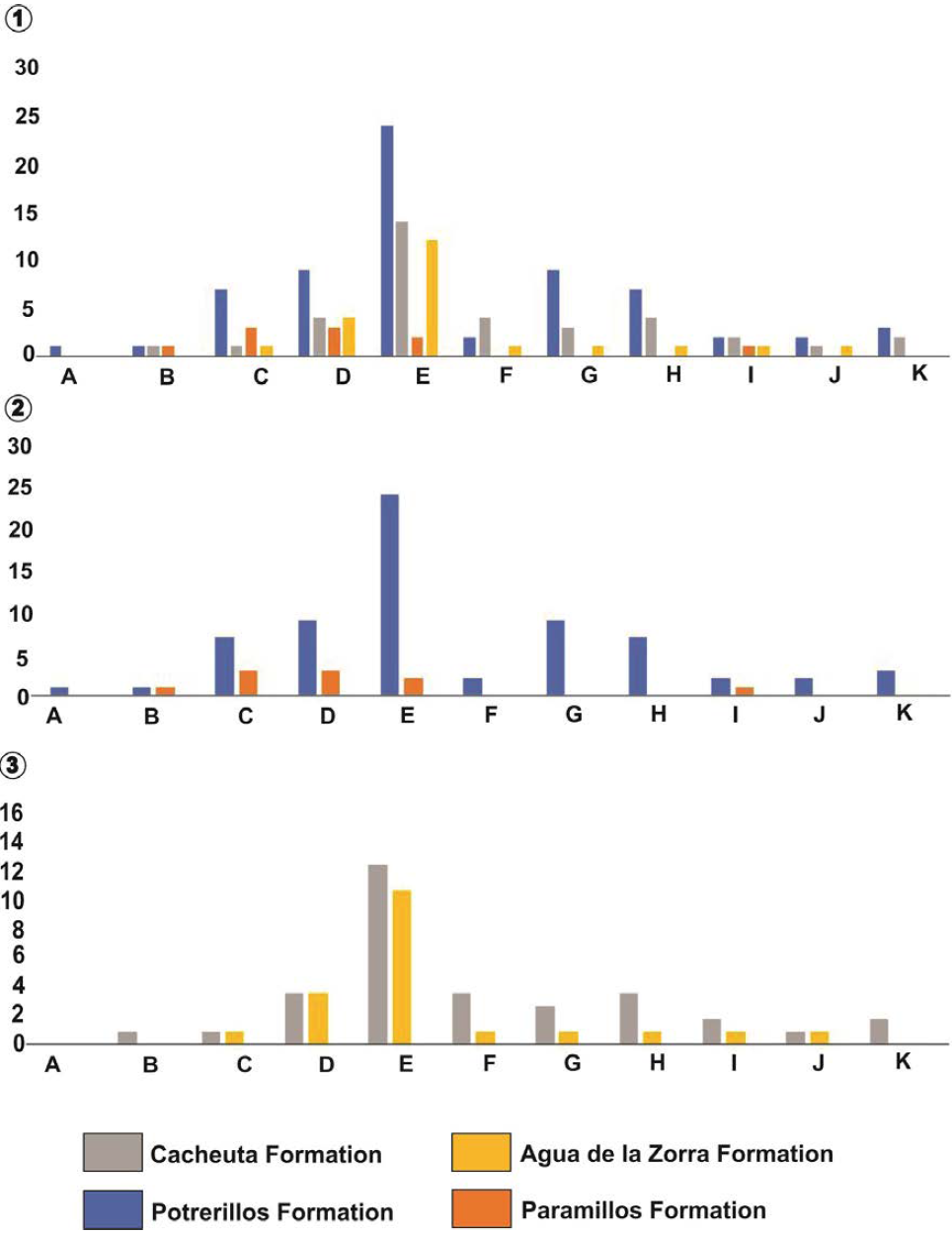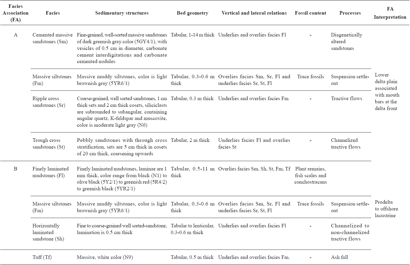 The Agua de la Zorra Formation was deposited in a deltaic and lacustrine system (Table 1, Fig.1.1 and 1.2). Facies association AZ-a included dark greenish gray fine-grained, well-sorted massive sandstones (Sm), with vesicles of 0.5 cm in diameter and carbonate cemented nodules; light brownish gray massive muddy siltstones (Fm); moderate light gray coarse-grained, well sorted sandstones with ripple cross-stratification (Sr), and through crossstratification pebbly sandstones (St) interpreted as lower delta plain associated with mouth bars at the delta front. The Facies association AZ-b is dominated by black, olive black, greenish red, and greenish black finely laminated mudstones (Fl); light brownish gray massive muddy siltstones (Fm), horizontally laminated fine to coarsegrained well sorted-sandstone (Sh), and massive white tuff (Tf) interpreted as prodelta to offshore lacustrine deposits.