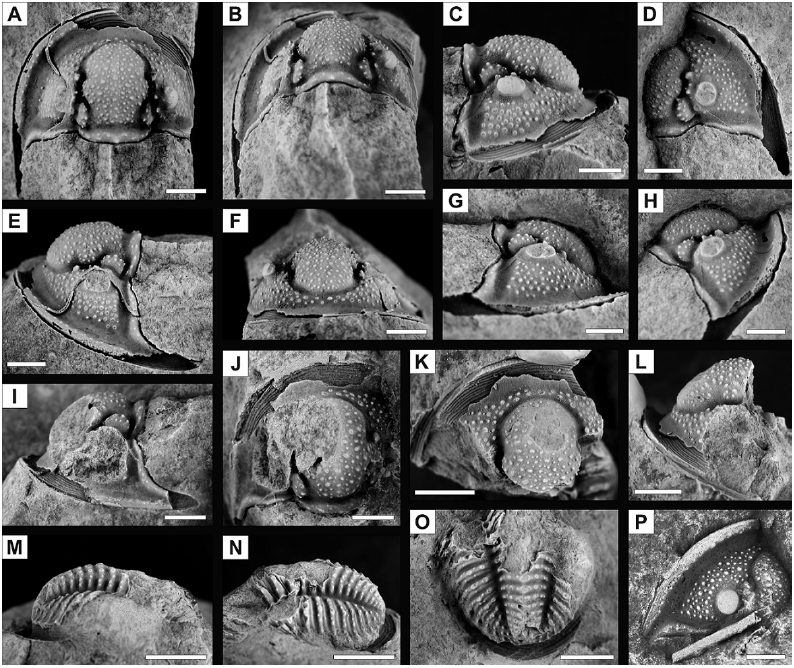 Description: Exoskeletal surface with numerous tubercles of different sizes. Cephalon semicircular in outline, strongly convex. Anterior margin of cranidium well rounded; glabella large, strongly inflated, surrounded by well defined axial furrows, subparallel-sided to subconical in outline and broadly rounded anteriorly, occupying 74-78% of the total cranidial length; with one to two pairs of glabellar furrows, of which the S1 is deepest and isolating subtriangular L1; occipital furrow straight to slightly bowed backwards, marked throughout, delimiting a short (sag.) and convex occipital ring. Preglabellar field very short (sag.); cephalic border furrow broad and concave; anterior border convex; anterior branches of facial sutures divergent forward; palpebral lobe prominent, elevated above surface of fixed cheek, situated close to the glabella and opposite S1; posterior branches oblique backwards; free cheek with a moderately long genal spine; cephalic doublure carrying 10-12 terrace lines. Pygidium semielliptical in outline, strongly convex; pygidial axis well defined, inflated, very long, tapered backwards, with 15 rings and a terminal piece; pleural fields large, with conspicuous pleural furrows and longitudinally arranged rows of tubercles of variable size.