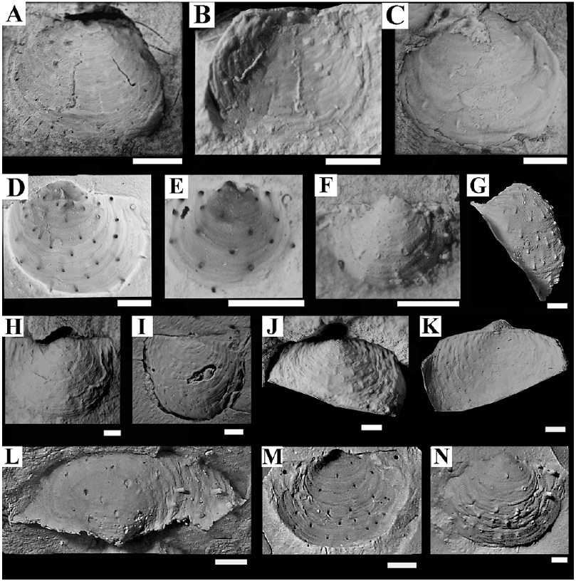 Description: Shell orbicular, acline. Anterior, ventral and posterior margins of disc regularly rounded. Cardinal margin straight, shorter than maximun width of shell. Umbo orthocline. Beak slightly projected above hinge margin. Anterior auricle slightly larger than posterior one. Left anterior auricle flat and subquadrate; posterior auricle triangular. Ligament area triangular, elongate, without a distinct chondrophore. External surface with inconspicuous comarginal growth-lines.