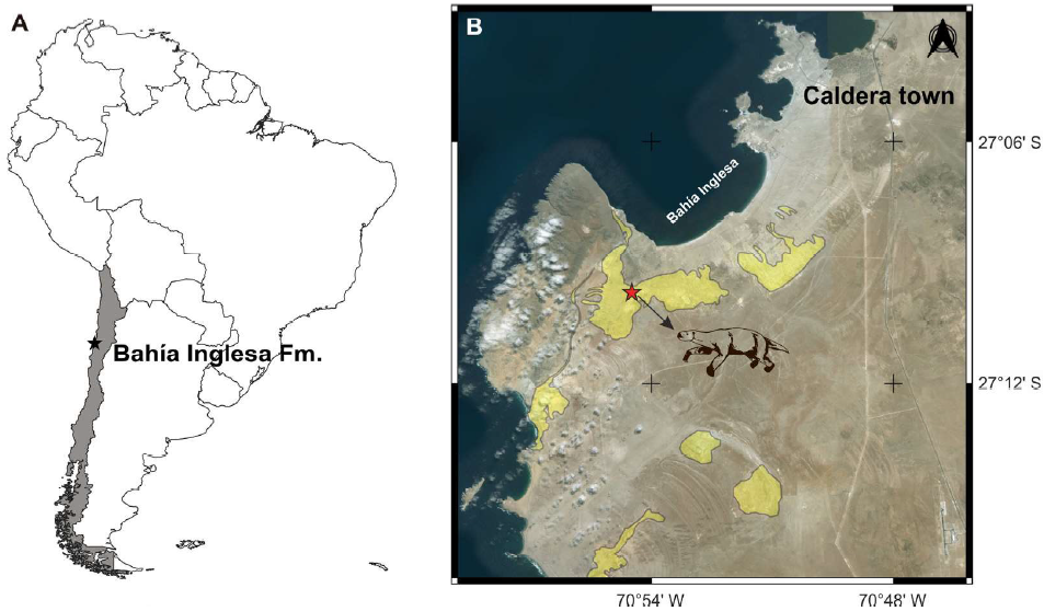 The Bahía Inglesa Formation forms a clastic and semi-consolidated sequence of Middle Miocene to Late Pliocene age, deposited in different sedimentary environments ranging from rocky shoreline to upper continental slope (Marquardt et al., 2000; Achurra, 2004; Le Roux et al., 2016). The main outcrops of the unit are found on the coast of the Atacama Region (around 27°S, Chile; e.g.,Le Roux et al., 2016). Bahía Inglesa Formation is highly fossiliferous, presenting different stratigraphic levels with abundant marine vertebrates (e.g.,Walsh and Hume, 2001; Suárez et al., 2004; Chávez, 2007, 2008) and invertebrates (Marchant et al., 2000). This Formation was formerly divided into three members, Morro, Bonebed and Lechero (Walsh and Suárez, 2005). But recent studies have divided the formation, from base to top, in nine members: El Pimiento, Puerto Viejo, Punta Totoral, Cerro Ballena, La Higuera, Chorrillos, Mina Fosforita, Rocas Negras and Quebrada Blanca (see Le Roux et al., 2016 for details). The specimen described here comes from outcrops near to the cities of Bahía Inglesa (Fig. 1), probably from the mine ‘’La Fosforita’’ (M. Suárez, personal communication, 2017), which belongs to the member Mina Fosforita. This member exhibits the greatest variability of depositional environments in the Bahía Inglesa Formation, ranging from the upper shoreface to the upper continental slope (see Le Roux et al., 2016 for details). The Mina Fosforita Member (ca. 7 Ma; Late Miocene) is characterized, among others, by the occurrence of abundant shark teeth and cetacean bones in successions of thick clay-rich sandstones (see Le Roux et al., 2016 for details).