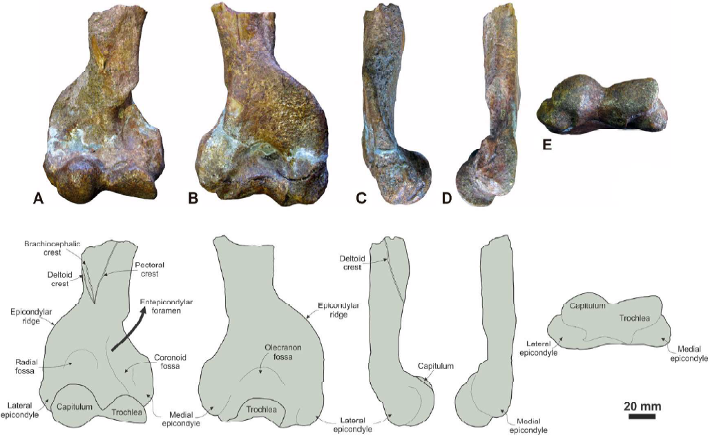 Referred material. CPUC/C/557, a well-preserved distal fragment of a right humerus, with an eroded entepicondylar crest.