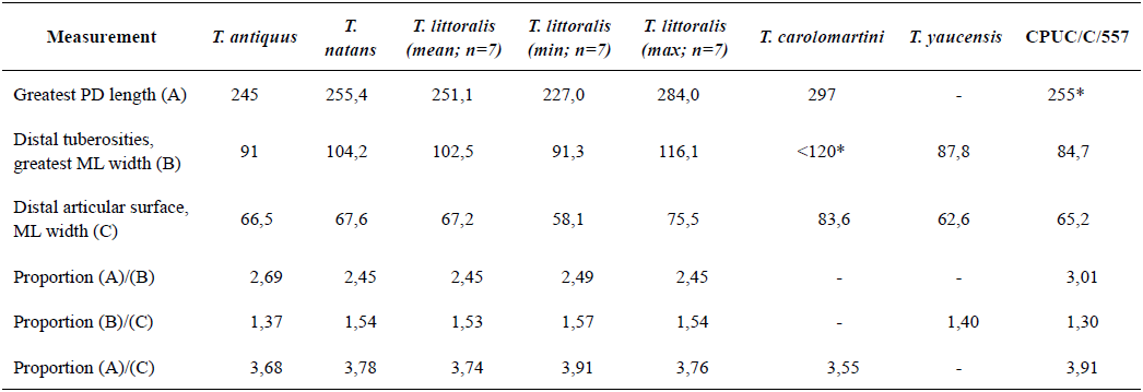 The epiphysis of CPUC/C/557 (Fig. 2), totally fused to the diaphysis indicates an adult individual. The proximo-distal length of the humerus fragment is 135 mm, while the proximo-distal length between the distal joint of the deltoid, pectoral and brachiocephalic crests and the distal surface of the humerus is 85 mm. Amson et al. (2015a) suggest that the junction of these crest is located approximately at the distal two-thirds of the shaft. Accordingly, the estimated proximo-distal length of the complete humerus (CPUC/C/557) must be ~255 mm. This length is similar to those reported for T. natans, and in the range of size of T. littoralis (Amson et al., 2015a). In CPUC/C/557, the distal medio-lateral width between the large tuberosities is 84.7 mm, being rather similar to those of T. yaucensis, and definitely narrower than the four other species especially compared with T. natans and T. littoralis (Amson et al., 2015a). The medio-lateral distal articular surface (capitulum plus the trochlea) is 65.2 mm width, being within the size range observed for the other species, except T. carolomartini (83.6 mm), which is apparently the largest known species (Amson et al., 2015a). The proportion between the medio-lateral distal articular surface and epicondylar width is 1.3 in CPUC/C/557, being smaller than other Thalassocnus spp. (Table 1). In addition, if we considered accurate the estimation of the proximo-distal humerus length of CPUC/C/557, the proportion between it and the epicondylar width would be 3, while in other Thalassocnus spp. range between 2.4-2.7 (no data for the two younger species; Table 1). These proportions suggest that in CPUC/C/557 the epicondylar width is smaller than in other recognized Thalassocnus species, excepting T. yaucensis.