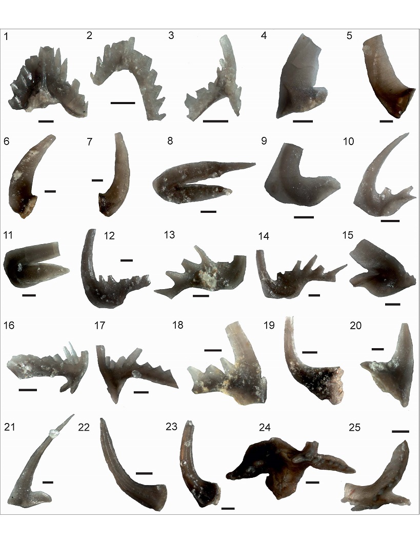 FIG. 5. Conodont species from the San Juan and Gualcamayo formations at the Cerro La Chilca section. 1-3. Microzarkodina hagetiana Stouge and Bagnoli, Sa elements, sample G6, CORD-MP 77061-77063. 4. Costiconus ethingtoni (Fåhræus), M element, sample SJ-1, CORD-MP 77064. 5-7. Parapaltodus simplicissimus Stouge, sample SJ-1; 5. Sc element, CORD-MP 77065; 6. M element, CORD-MP 77066; 7. P element, CORD-MP 77067. 8-9. Paroistodus originalis (Sergeeva), sample SJ-1; 8. M element, CORD-MP 77068; 9. Sa element, CORD-MP 77069. 10. Paroistodus horridus secundus Albanesi, Sc element, sample SJ-1, CORD-MP 77070. 11-14. Paroistodus horridus horridus (Barnes and Poplawski), 11. M element, sample SJ-1, CORD-MP 77071; 12. Sa element, sample G6, CORD-MP 77072; 13. Sc element, sample SJ-1, CORD-MP 77073; 14. P element, sample G6, CORD-MP 77074. 15-18. Periodon macrodentatus (Graves and Ellison), 15. M element, sample SJ-1, CORD-MP 77075; 16. Sa element, sample G7, CORD-MP 77076; 17. Sc element, sample SJ-1, CORD-MP 77077; 18. Pa element, sample G7, CORD-MP 77078. 19. Protopanderodus gradatus Serpagli, Sa element, sample G6, CORD-MP 77079. 20-21. Pteracontiodus cryptodens Mound, sample SJ-1, 20. Sc element, CORD-MP 77080; 21. P element, CORD-MP 77081. 22-23. Scolopodus striatus Pander, sample SJ-1, 22. Sc element CORD-MP 77082; 23. M element CORD-MP 77083. 24-25. Yangtzeplacognathus crassus (Chen and Zhang), sample SJ-1; 24. Pa elements CORD-MP 77084; 25. Pb element CORD-MP 77085. Sacle: 0.1 mm.