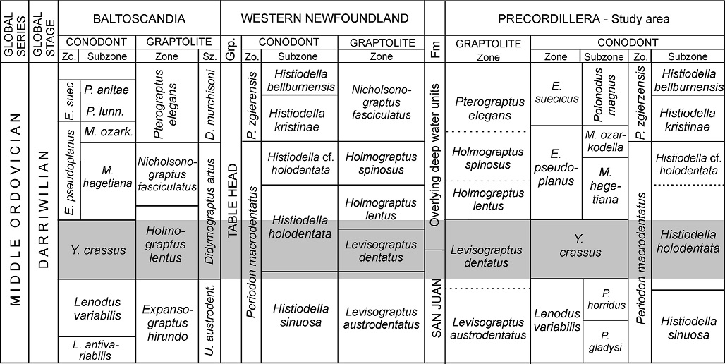 The key taxa Y. crassus was first recorded in the San Juan Formation at Central Precordillera by Lehnert (1995), although this author identified it as E. suecicus Bergström, and was then documented in numerous works (e.g., Albanesi et al., 2006, 2013; Heredia et al., 2005; Heredia and Mestre, 2011; Mestre and Heredia, 2013; Feltes et al., 2016; Serra et al., 2015, 2017).