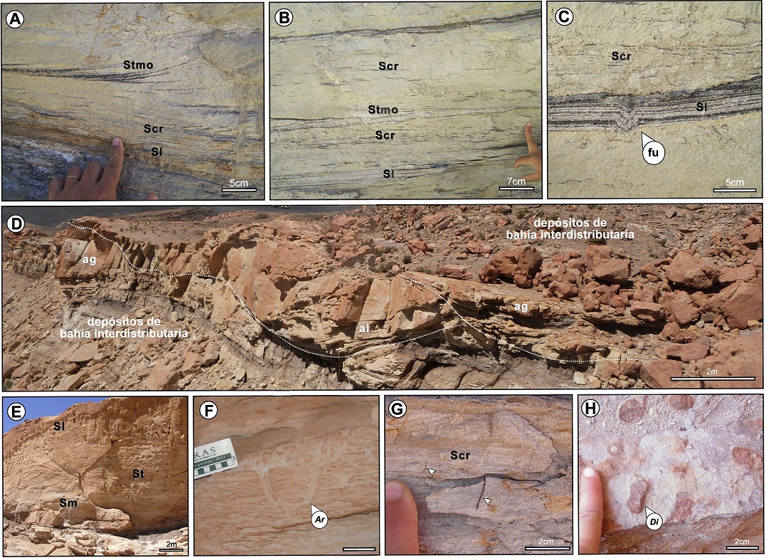 Fig. 8. Asociaciones de facies hiperpícnicas (AF6). A-C. Pasaje transicional y recurrente de estructuras sedimentarias. Arenisca fina a media con laminación paralela (Sl). Arenisca fina a media con óndulas escalantes (Scr). Arenisca fina a gruesa con estratificación entrecruzada tangencial con materia orgánica particulada en las caras de avalancha (Stmo). En C se puede observar la presencia de una traza de escape (fu). Note la abundante concentración de agregados de fango y fitodetrito en la cara de avalancha de las diferentes estructuras sedimentarias tractivas. D. Vista panorámica de sistemas de canal-albardón dominados por flujos hiperpícnicos de gran escala erosionando las asociaciones de facies de bahía interdistributaria. El relleno del canal comienza con el desarrollo de estructuras de acreción lateral (al) indicativas de canales de alta sinuosidad y culmina con un relleno agradacional (ag) con marcada relación de onlap sobre las zonas marginales del canal, propias de canales de baja sinuosidad. E. Detalle del relleno de un canal donde se reconoce un pasaje transicional entre areniscas masivas (Sm), estratificación entrecruzada tangencial (St) y laminación paralela (Sl). F. Vista en sección de un ejemplar de Arenicolites isp. (Ar). G. Vista en sección de ondulitas escalantes (Scr) con rizolitos (echas blancas), correspondientes a depósitos de albardón. H. Vista basal de un sistema canalizado con ejemplares de Diplocraterion isp. (Di) correspondientes al desarrollo de una superficie sustrato-controlada (icnofacies de Glossifungites).