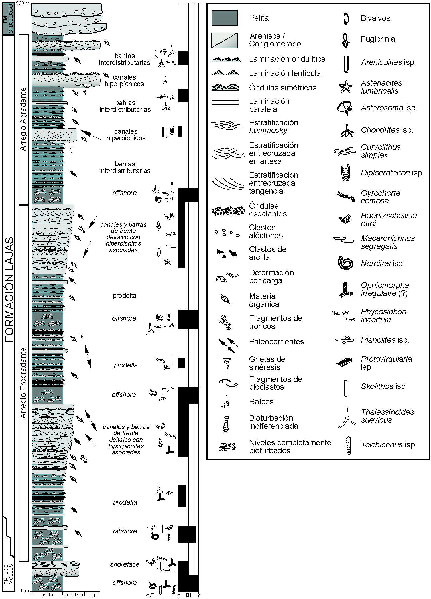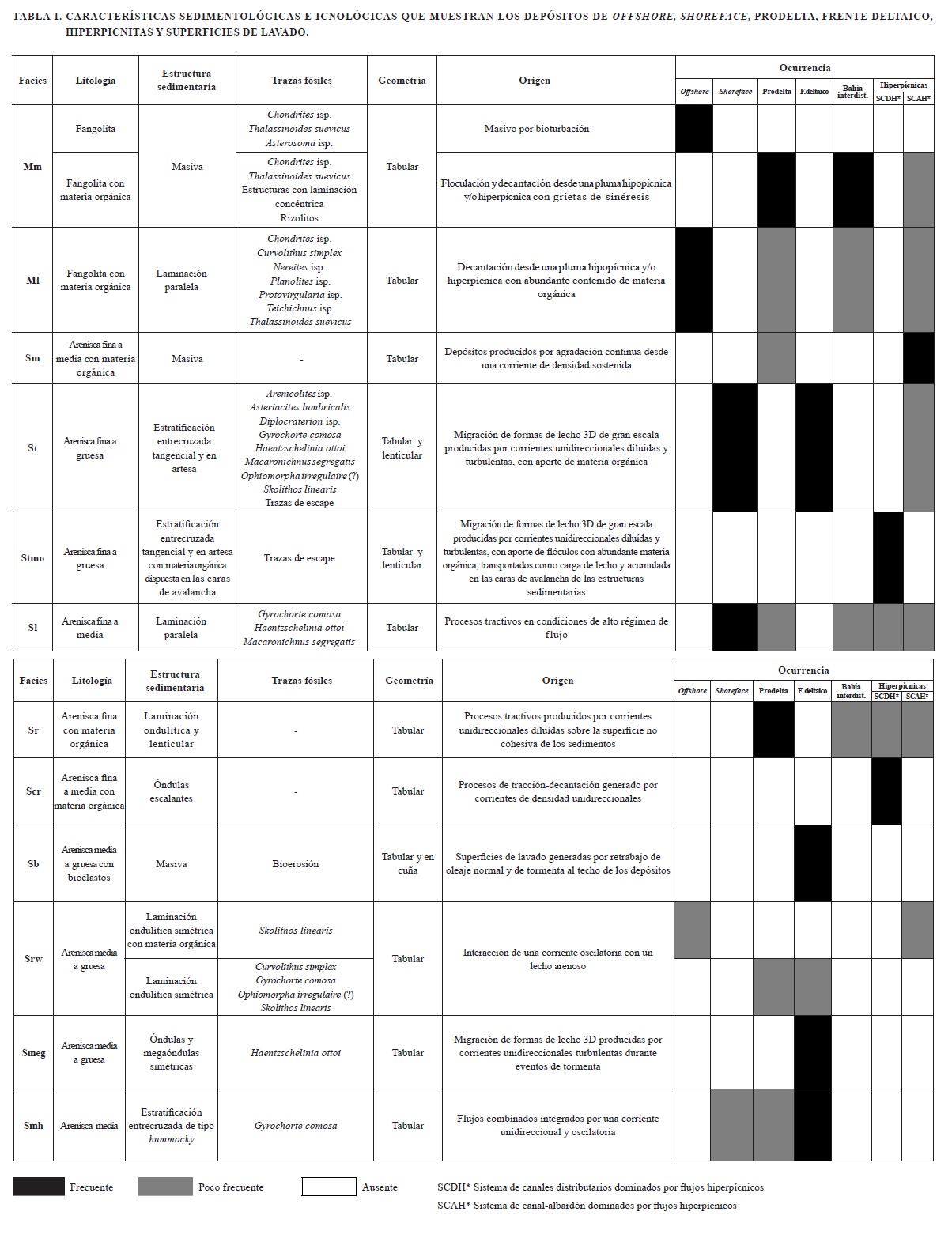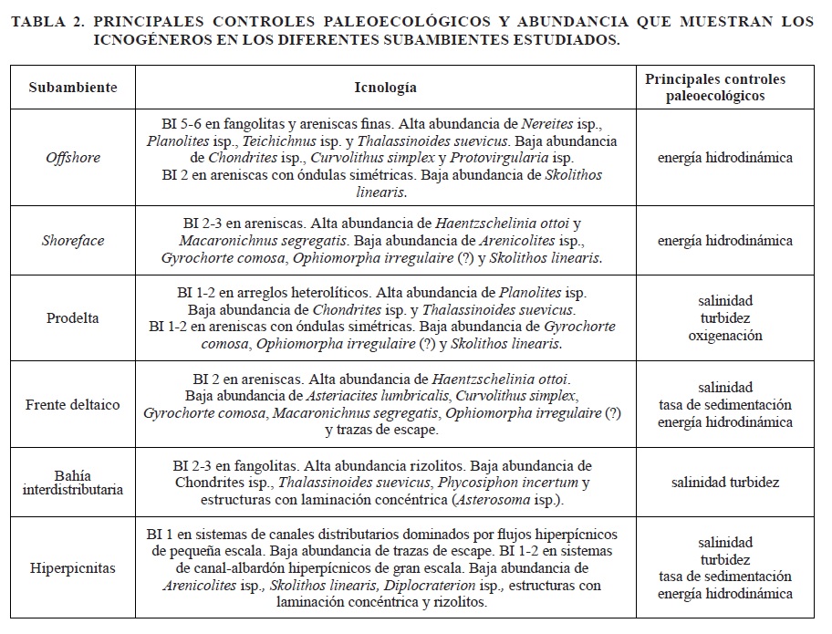 Los depósitos de offshore-shoreface se reconocieron a la base de la sucesión estratigráfica y son los que muestran la mayor diversidad y abundancia de trazas fósiles. Los depósitos de prodelta, frente deltaico y bahía interdistributaria han sido reconocidos en la sección media y superior y muestran una moderada diversidad y abundancia de trazas fósiles, mientras que las hiperpicnitas muestran ausencia de trazas fósiles o pequeños intervalos estratigráficos con presencia de trazas de escape.
