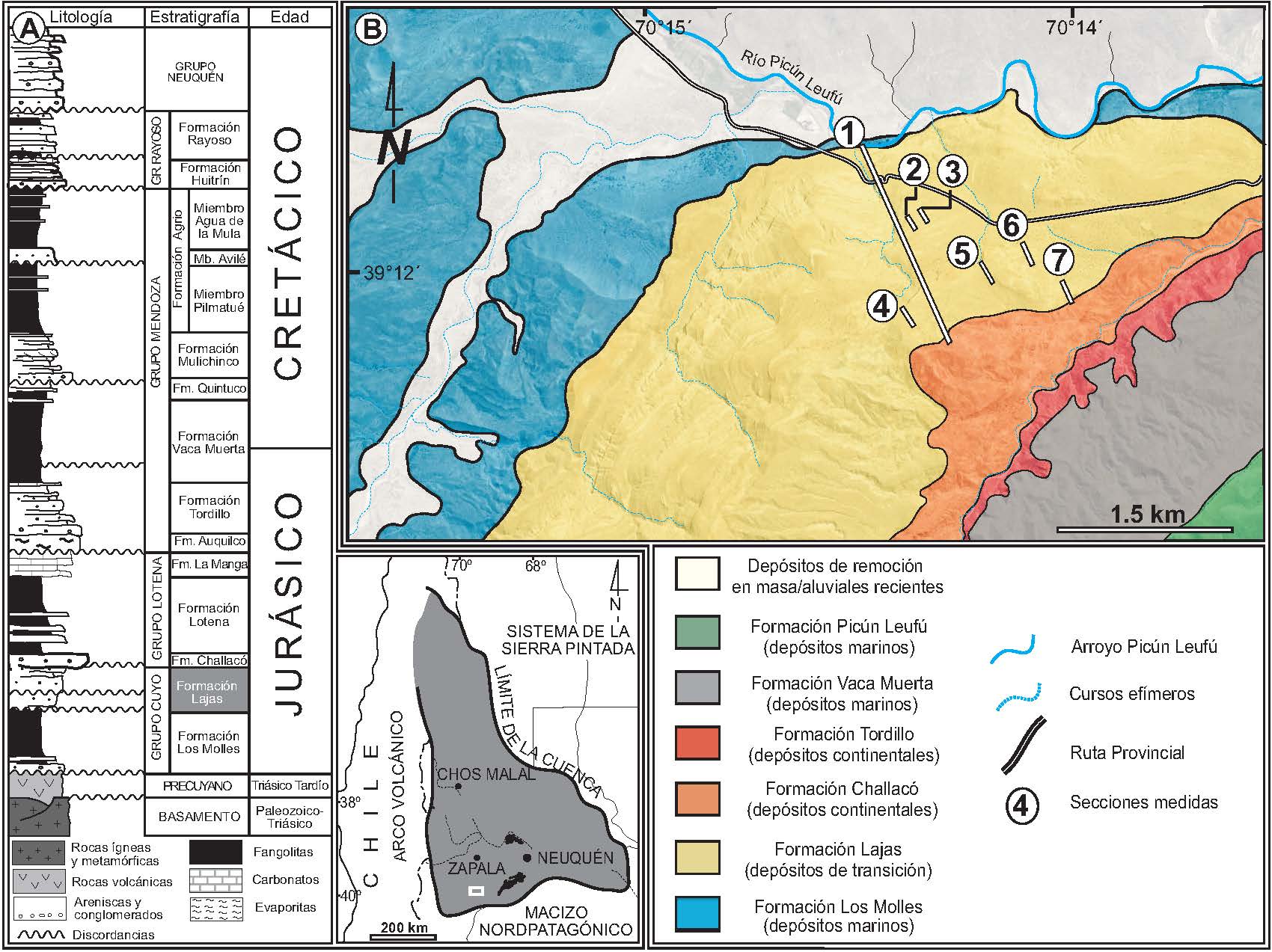 En el área de Picún Leufú, el Grupo Cuyo está representado por sucesiones dominantemente pelíticas de offshore-shoreface que intercalan con cuerpos lenticulares de areniscas generadas por corrientes de densidad correspondientes a la Formación Los Molles (Dellapé et al., 1979; Gulisano y Gutiérrez Pleimling, 1995; Paim et al., 2008). Esta unidad es sucedida por depósitos deltaicos de la Formación Lajas (Weaver, 1931), los cuales son cubiertos por depósitos aluviales a fluviales de la Formación Challacó (de Ferraríis, 1947; Veiga, 2000) (Fig. 1B). En esta localidad, las rocas sedimentarias de la Formación Lajas han sido originalmente interpretadas como correspondiente a depósitos mareales (Dean, 1987; Gulisano y Pando, 1981; Legarreta y Gulisano, 1989; Rosenfeld y Volkheimer, 1979; Leanza et al., 2001), mientras que en estudios más recientes se han identificado depósitos de plataforma, depósitos deltaicos fluvio-dominados, dominados por oleaje y dominados por marea, además de estuarios y barras mareales (Zavala, 1993; McIlroy et al., 2005; McIlroy, 2007; Gugliotta et al., 2015; Rossi y Steel, 2016).