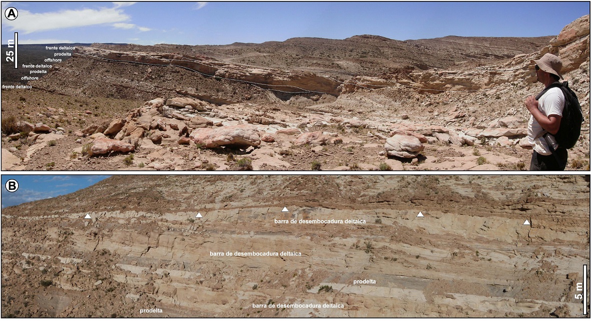 Resumen: El análisis sedimentológico e icnológico de la Formación Lajas (Jurásico Medio) en el área de Bajada de Los Molles permitió reconocer depósitos de offshore superior-shoreface inferior que pasan en transición hacia sucesiones de prodelta, frente deltaico y bahía interdistributaria. La presencia de un gran número de depósitos de canales distributarios con abundante contenido de materia orgánica particulada y la muy baja diversidad y abundancia de trazas fósiles, permiten clasificar a este sistema como un delta de tipo fluvio-dominado. En el tramo basal y superior de la sucesión analizada son comunes los depósitos generados por descargas de densidad hiperpícnicas. Internamente las hiperpicnitas conforman sistemas de canal-albardón y canales distributarios, integrados por areniscas masivas y estructuras de deformación por carga, o por un pasaje transicional y recurrente de estructuras sedimentarias tractivas con abundante presencia de materia orgánica particulada en sus caras de avalancha. La mayor diversidad y abundancia de trazas fósiles se reconoce en los depósitos de offshore superior-shoreface inferior, con desarrollo de las icnofacies de Skolithos y Cruziana. Los depósitos deltaicos muestran un contenido de trazas fósiles con menos abundancia y diversidad respecto de los anteriores, mientras que las hiperpicnitas son los depósitos que muestran la menor diversidad y abundancia de trazas fósiles o la ausencia de estructuras biogénicas, situación que reflejaría la condición de mayor estrés dentro del sistema analizado.