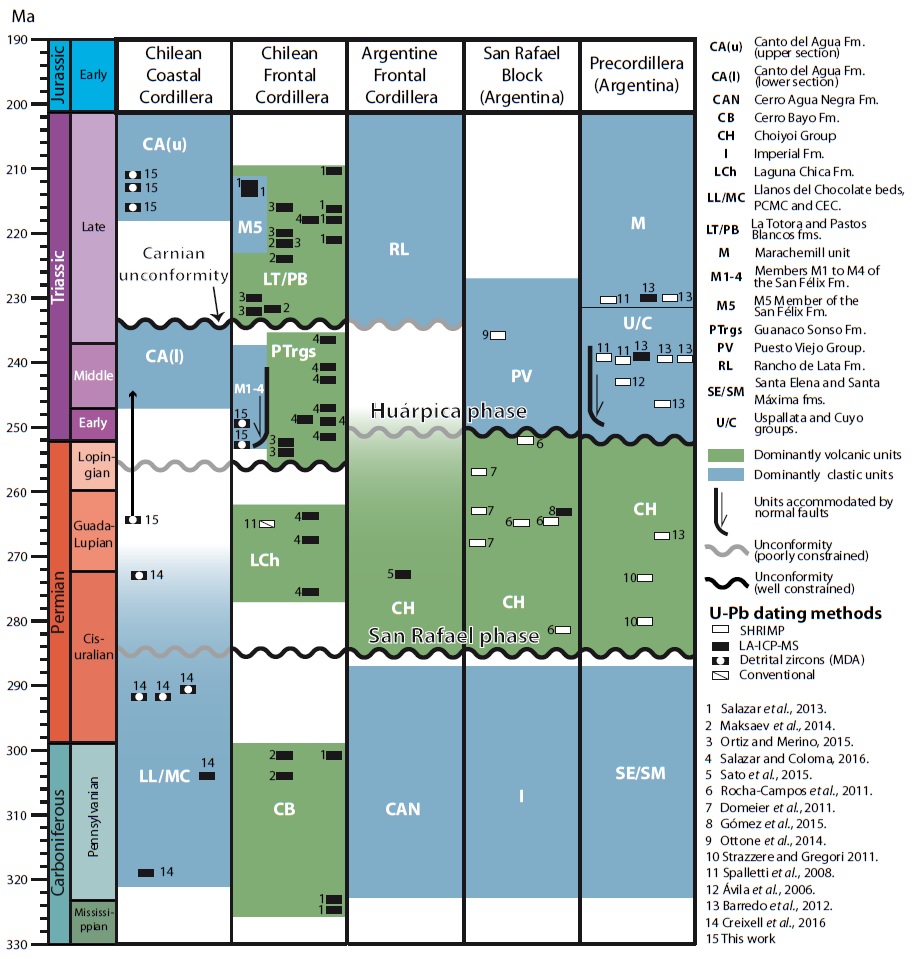 The Carboniferous to Triassic stratigraphic record of the outward Pangea margin shows global discontinuities that mark major shifts in the geodynamic configuration of the supercontinent at 280, 260 and 230 Ma (Riel et al., 2018). In the studied segment of the southwestern margin of Gondwana, recent studies and the results of this work allow to better constraint the timing and distribution of these unconformities (Fig. 9).