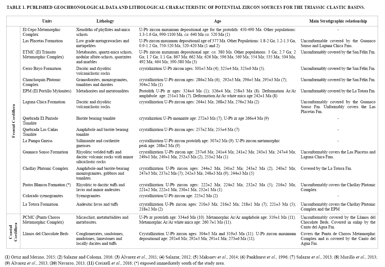 Nine U-Pb zircon ages obtained by several authors in the study area (Álvarez et al., 2011; Salazar et al., 2013; Maksaev et al., 2014; Salazar and Coloma, 2016) allows to constraint the construction of this plutonic complex between 248 and 237 Ma (Lower-Middle Triassic) (Table 1).