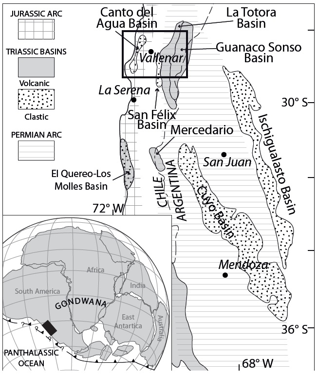 FIG. 1. Location and regional geological context of the study area. Features distribution in Chile and Argentina modified from Charrier et al. (2007) and Franzese and Spalletti (2001), Gondwana reconstruction modified from Torsvik and Cocks (2013) and Castillo et al. (2017) and references therein. .